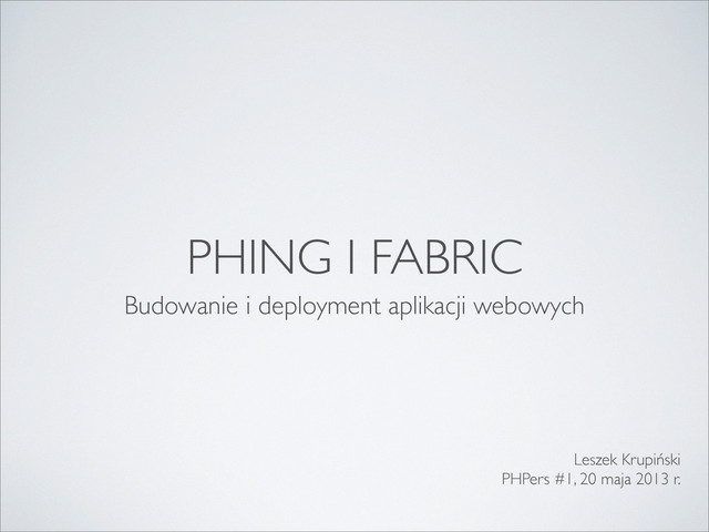 Najpopularniejszym narzędziem do budowania aplikacji PHP jest Phing, program wzorowany na systemie Ant, znanym ze świata Java'y. Z kolei do instalacji web-aplikacji na serwerze, czyli deploymentu, jedną z opcji jest system Fabric. W czasie wykładu postaram się pokazać do czego można wykorzystać Phinga, i jak - nie znając Pythona - napisać proste skrypty dla Fabrica.