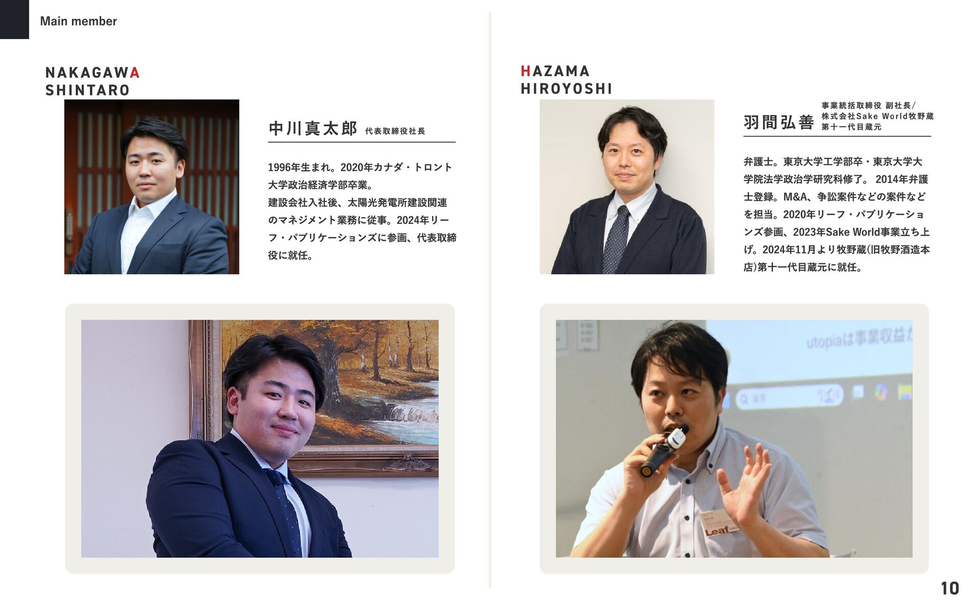 A G A W A S H I N T A R O 中川真太郎 Main member 弁護⼠。東京⼤学⼯学部卒・東京⼤学⼤ 学院法学政治学研究科修了。 2014年弁護 ⼠登録。M&A、争訟案件などの案件など を担当。2020年リーフ・パブリケーショ ンズ参画、2023年Sake World事業⽴ち上 げ。2024年11⽉より牧野蔵(旧牧野酒造本 店)第⼗⼀代⽬蔵元に就任。 事業統括取締役 副社⻑/ 株式会社Sake World牧野蔵 第⼗⼀代⽬蔵元 ⽻間弘善 H A Z A M A H I R O Y O S H I 10