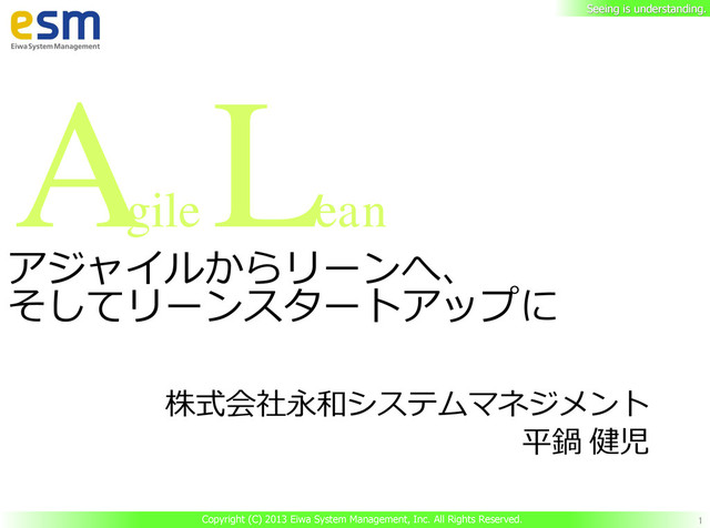 Seeing is understanding. 1 Agile Lean 株式会社永和システムマネジメント 平鍋 健児 アジャイルからリーンへ、 そしてリーンスタートアップに