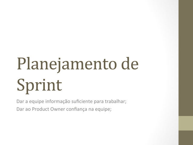 DAS TRINCHEIRAS Escopo e importância são definidos pelo product owner. Es definida pela equipe. Durante uma reunião de planejamento estas três variáveis são refinadas continuamente por diálogo entre equipe e product owner. Normalmente, o product owner inicia a reunião resumindo se Essas três variáveis precisam ser refinadas con=nuamente por diálogo “cara-‐a-‐cara” entre a equipe e o P.O.