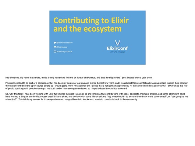 Full slides without transcriptions available at https://speakerdeck.com/leandrocp/contributing-to-elixir-and-the-ecosystem-elixirconf-us-2020