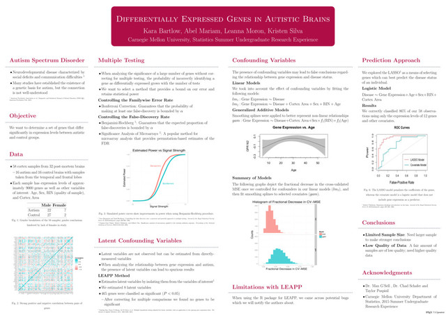 Kara Bartlow, Abel Mariam, Leanna Moron, Kristen Silva Carnegie Mellon University, Statistics Summer Undergraduate Research Experience Differentially Expressed Genes in Autistic Brains Kara Bartlow, Abel Mariam, Leanna Moron, Kristen Silva Carnegie Mellon University, Statistics Summer Undergraduate Research Experience Autism Spectrum Disorder • Neurodevelopmental disease characterized by social deficits and communication difficulties 1 • Many studies have established the existence of a genetic basis for autism, but the connection is not well-understood 1 American Psychiatric Association et al. Diagnostic and Statistical Manual of Mental Disorders (DSM-5®). American Psychiatric Pub, 2013. Objective We want to determine a set of genes that differ significantly in expression levels between autistic and control groups. Data • 58 cortex samples from 32 post-mortem brains – 16 autism and 16 control brains with samples taken from the temporal and frontal lobes • Each sample has expression levels of approx- imately 9000 genes as well as other variables of interest: Age, Sex, RIN (quality of sample), and Cortex Area Male Female Autism 22 7 Control 27 2 Fig. 1: Gender breakdown of the 58 samples; gender conclusions hindered by lack of females in study. EEF1A1 RPS28 IPO13 LPP HNRPAB SNIP1 COL17A1 HMG20B TICAM2 SERTAD2 SPP1 AUP1 MFN2 BRD9 SELM ZFPM1 HIST1H2BD GADD45G ERGIC1 C4ORF8 SKIV2L2 NUMBL KDELC2 AQP3 MARK4 EXOC6 GPC2 MBTPS1 TGOLN2 TMEM25 MKL1 MAP3K11 SLC38A2 GSTM4 GRIK1 GALNT11 BASP1 CCT3 EHD1 RND1 RPS16 UBIAD1 CWF19L1 SETD8 TPST1 ABCC5 C6ORF129 PPEF1 CSNK1G3 MGC42105 LMBRD1 DVL2 COX4I1 HSPC049 CBR3 POPDC3 FBXO32 TTC8 LOC200312 FN3KRP PDHX KIAA1324L SUCLG2 RAB2 PRKCBP1 SPATA7 MTHFD2L LOC112714 SLC26A4 THAP7 APEX2 C21ORF25 MTMR9 C9ORF28 C5ORF16 DTNA ACTR5 C9ORF19 FAM89A TMCO5 C14ORF2 ERF WDR71 C19ORF37 HIC2 LOC400451 ATP5J CDC5L PRRG3 NUP160 CABLES1 COL4A1 ECH1 PER1 CSTF2 SH3D19 SNCG AAMP SLC22A17 EFEMP2 EEF1A1 RPS28 IPO13 LPP HNRPAB SNIP1 COL17A1 HMG20B TICAM2 SERTAD2 SPP1 AUP1 MFN2 BRD9 SELM ZFPM1 HIST1H2BD GADD45G ERGIC1 C4ORF8 SKIV2L2 NUMBL KDELC2 AQP3 MARK4 EXOC6 GPC2 MBTPS1 TGOLN2 TMEM25 MKL1 MAP3K11 SLC38A2 GSTM4 GRIK1 GALNT11 BASP1 CCT3 EHD1 RND1 RPS16 UBIAD1 CWF19L1 SETD8 TPST1 ABCC5 C6ORF129 PPEF1 CSNK1G3 MGC42105 LMBRD1 DVL2 COX4I1 HSPC049 CBR3 POPDC3 FBXO32 TTC8 LOC200312 FN3KRP PDHX KIAA1324L SUCLG2 RAB2 PRKCBP1 SPATA7 MTHFD2L LOC112714 SLC26A4 THAP7 APEX2 C21ORF25 MTMR9 C9ORF28 C5ORF16 DTNA ACTR5 C9ORF19 FAM89A TMCO5 C14ORF2 ERF WDR71 C19ORF37 HIC2 LOC400451 ATP5J CDC5L PRRG3 NUP160 CABLES1 COL4A1 ECH1 PER1 CSTF2 SH3D19 SNCG AAMP SLC22A17 EFEMP2 −1.0 −0.5 0.0 0.5 1.0 Correlation Fig. 2: Strong positive and negative correlation between pairs of genes Multiple Testing • When analyzing the significance of a large number of genes without cor- recting for multiple testing, the probability of incorrectly identifying a gene as differentially expressed grows with the number of tests • We want to select a method that provides a bound on our error and retains statistical power Controlling the Familywise Error Rate • Bonferroni Correction: Guarantees that the probability of making at least one false-discovery is bounded by α Controlling the False-Discovery Rate • Benjamini-Hochberg 1: Guarantees that the expected proportion of false-discoveries is bounded by α • Significance Analysis of Microarrays 2: A popular method for microarray analysis that provides permutation-based estimates of the FDR 0.00 0.25 0.50 0.75 1.00 0.0 0.5 1.0 1.5 Signal Strength Estimated Power Estimated Power vs Signal Strength Benjamini Bonferroni Fig. 3: Simulated power curves show improvements in power when using Benjamini-Hochberg procedure. 1 Yoav Benjamini and Yosef Hochberg. Controlling the false discovery rate: a practical and powerful appraoch to multiple testing. Journal fo the Royal Statistical Society. Series B (Methodological), pages 289-300, 1995. 2 Virginia Goss Tusher, Robert Tibshirani, and Gilbert Chu. Significance analysis of microarrays applied to the ionizing radiation response. Proceedings of the National Academy of Sciences, 98(9):5116-5125, 2001. Latent Confounding Variables • Latent variables are not observed but can be estimated from directly- measured variables • When analyzing the relationship between gene expression and autism, the presence of latent variables can lead to spurious results LEAPP Method • Estimates latent variables by isolating them from the variables of interest1 • We estimated 8 latent variables • 465 genes were classified as significant (P < 0.05) – After correcting for multiple comparisons we found no genes to be significant 1 Yunting Sun, Nancy R Zhang, Art B Owen, et al. Multiple hypothesis testing adjusted for latent variables, with an application to the agemap gene expression data. The Annals of Applied Statistics, 6(4): 1664-1688, 2012. Confounding Variables The presence of confounding variables may lead to false conclusions regard- ing the relationship between gene expression and disease status. Linear Models We took into account the effect of confounding variables by fitting the following models: lm1 : Gene Expression ∼ Disease lm2 : Gene Expression ∼ Disease + Cortex Area + Sex + RIN + Age Generalized Additive Models Smoothing splines were applied to better represent non-linear relationships gam : Gene Expression ∼ Disease+Cortex Area+Sex+f1 (RIN)+f2 (Age) Summary of Models The following graphs depict the fractional decrease in the cross-validated MSE once we controlled for confounders in our linear models (lm2 ), and then fit smoothing splines to selected covariates (gam). 0 100 200 300 400 0 100 200 300 400 lm2 gam 0.00 0.25 0.50 0.75 1.00 Fractional Decrease in CV−MSE Counts Model lm2 gam Histogram of Fractional Decrease in CV−MSE Limitations with LEAPP When using the R package for LEAPP, we came across potential bugs which we will notify the authors about. Prediction Approach We explored the LASSO1 as a means of 
