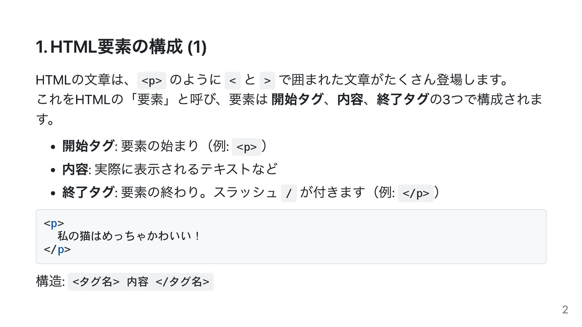 これをHTMLの「要素」と呼び、要素は 開始タグ、内容、終了タグの3つで構成されま す。 開始タグ: 要素の始まり(例: <p> ) 内容: 実際に表示されるテキストなど 終了タグ: 要素の終わり。スラッシュ / が付きます(例: </p> ) <p> 私の猫はめっちゃかわいい! </p> 構造: <タグ名> 内容 </タグ名> 2