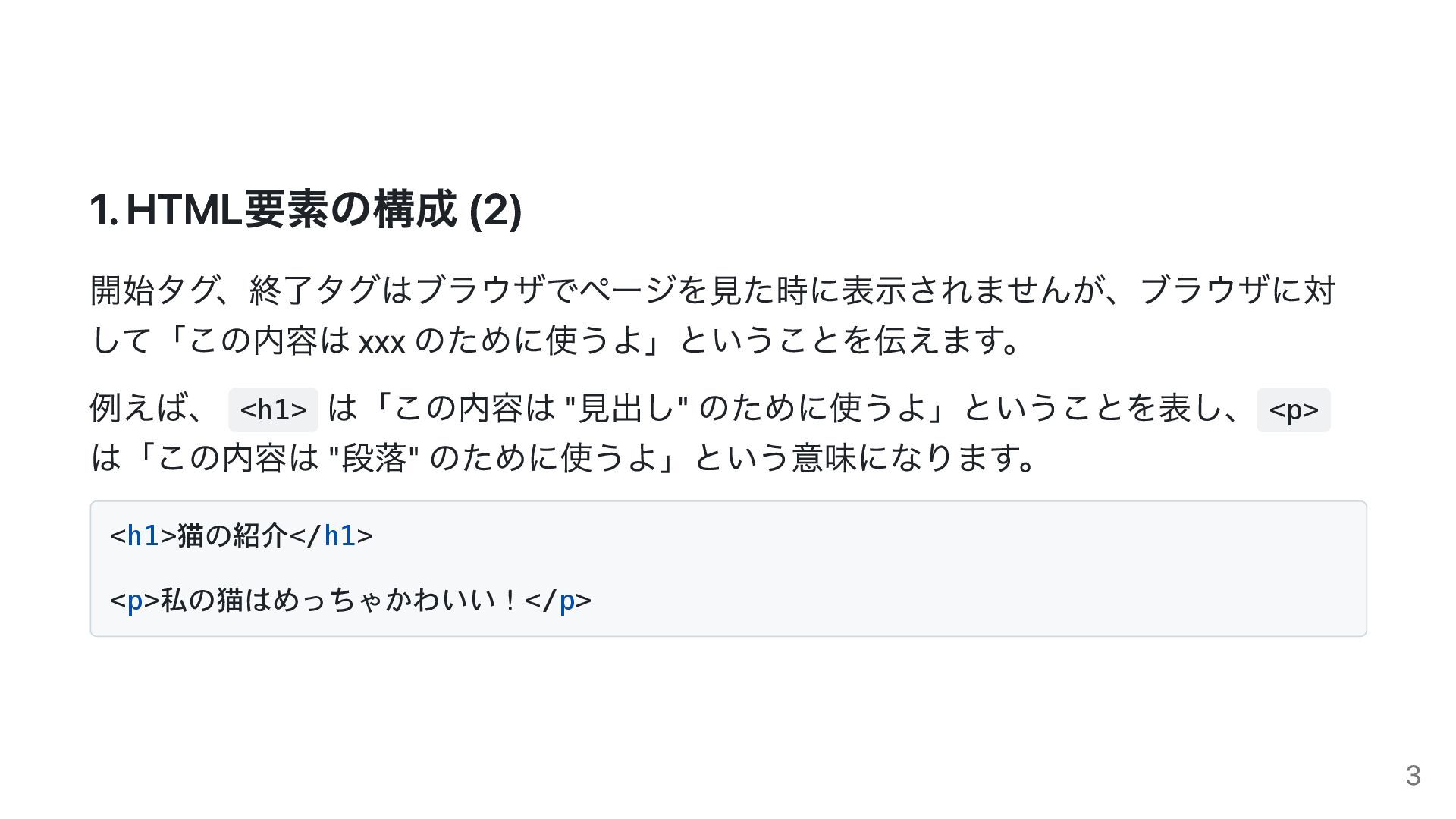 "見出し" のために使うよ」ということを表し、 <p> は「この内容は "段落" のために使うよ」という意味になります。 <h1>猫の紹介</h1> <p>私の猫はめっちゃかわいい!</p> 3