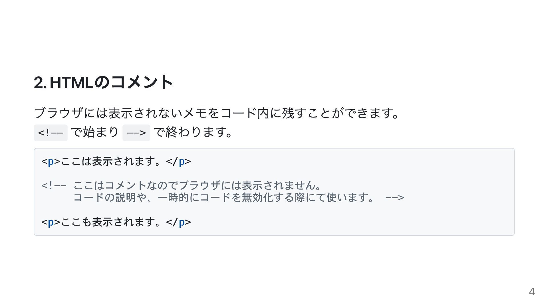 コードの説明や、一時的にコードを無効化する際にて使います。 --> <p>ここも表示されます。</p> 4