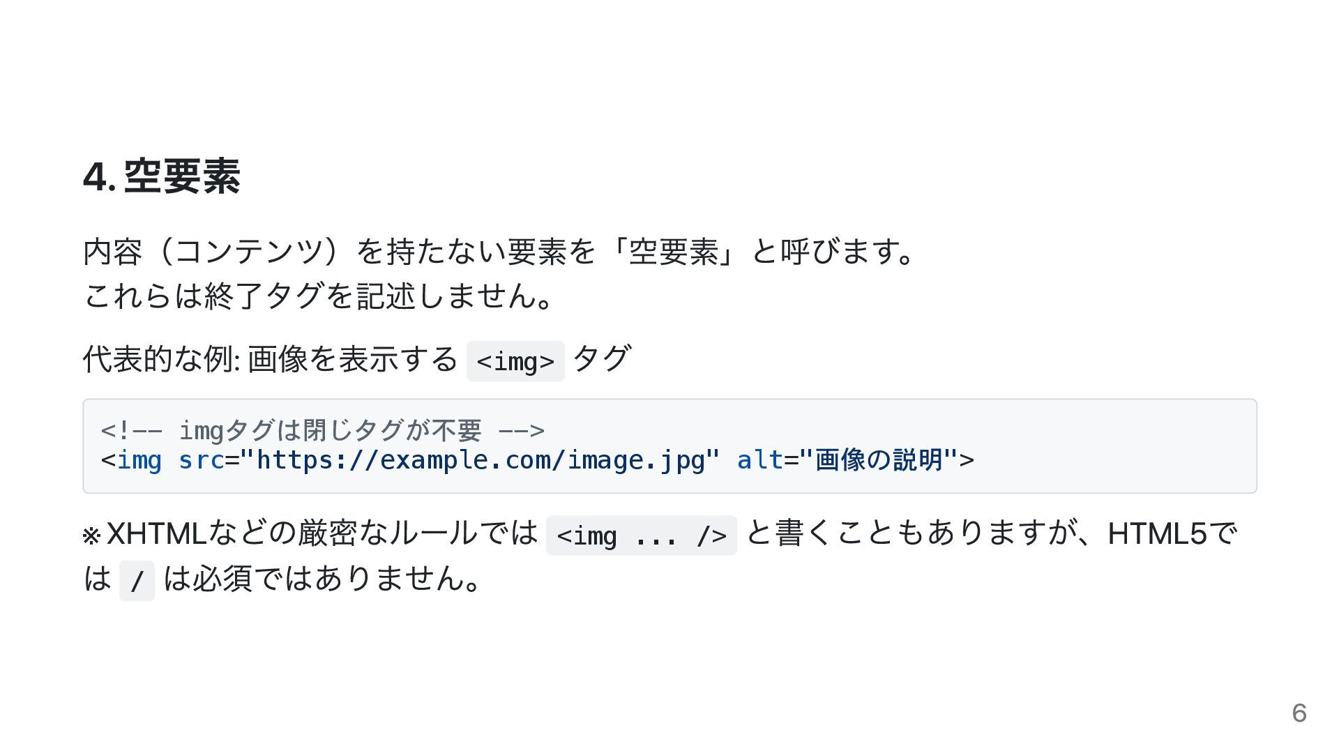 4. 空要素 内容(コンテンツ)を持たない要素を「空要素」と呼びます。 これらは終了タグを記述しません。 代表的な例: 画像を表示する <img> タグ <!-- imgタグは閉じタグが不要