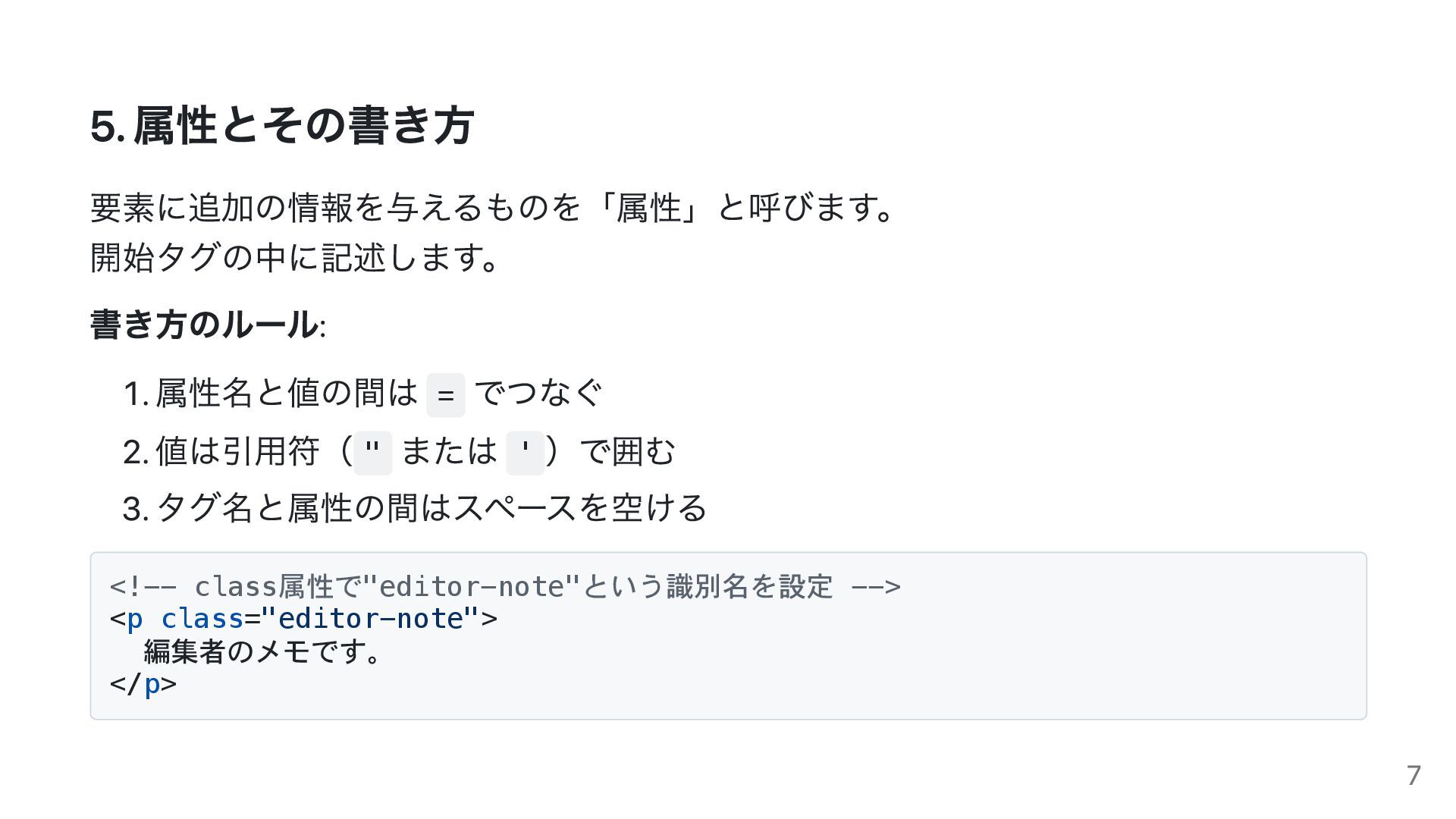 値は引用符( " または ' )で囲む 3. タグ名と属性の間はスペースを空ける <!-- class属性で"editor-note"という識別名を設定 --> <p class="editor-note"> 編集者のメモです。 </p> 7