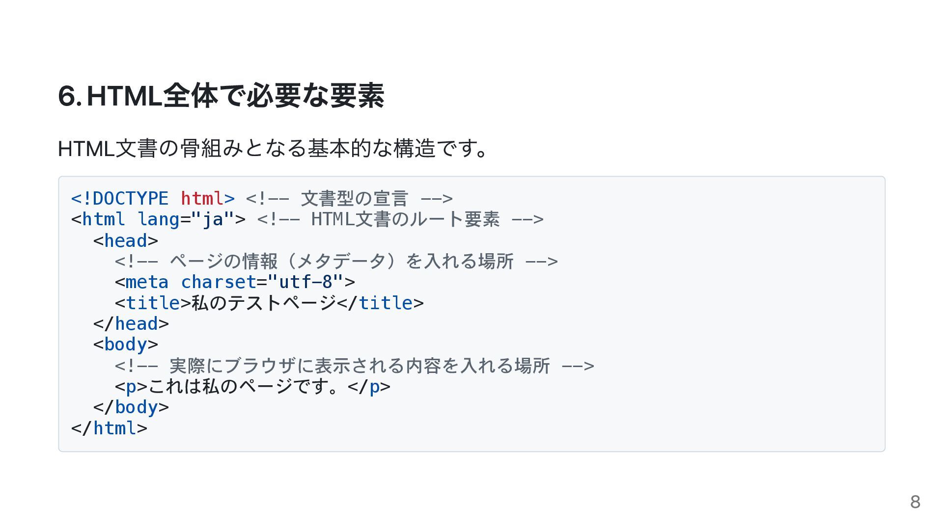 6. HTML全体で必要な要素 HTML文書の骨組みとなる基本的な構造です。 <!DOCTYPE html> <!-- 文書型の宣言 --> <html lang="ja">