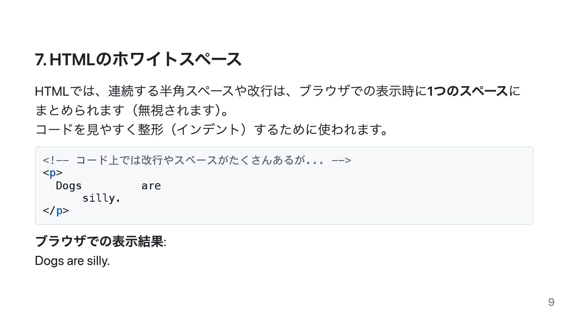 7. HTMLのホワイトスペース HTMLでは、連続する半角スペースや改行は、ブラウザでの表示時に1つのスペースに まとめられます(無視されます) 。 コードを見やすく整形(インデント)するために使われます。 <!-- コード上では改行やスペースがたくさんあるが... --> <p>