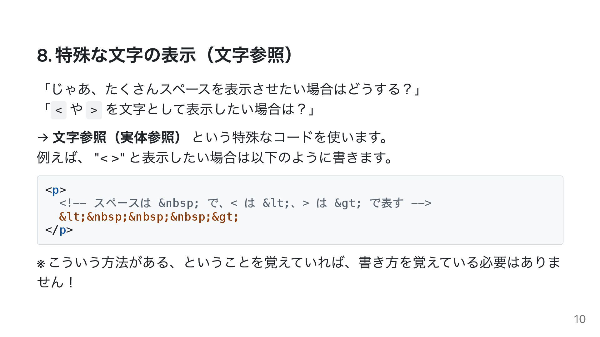 という特殊なコードを使います。 例えば、 "< >" と表示したい場合は以下のように書きます。 <p> <!-- スペースは で、< は <、> は > で表す --> < > </p> ※ こういう方法がある、ということを覚えていれば、書き方を覚えている必要はありま せん! 10