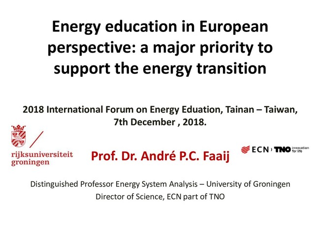 the energy transition 2018 International Forum on Energy Eduation, Tainan – Taiwan, 7th December , 2018. Prof. Dr. André P.C. Faaij Distinguished Professor Energy System Analysis – University of Groningen Director of Science, ECN part of TNO