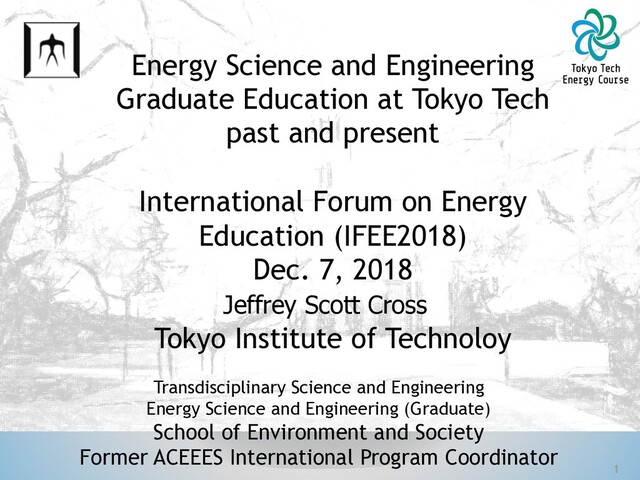 Institute of Technology Transdisciplinary Science and Engineering Energy Science and Engineering (Graduate) School of Environment and Society From Energy Policy to Utilizing Green Chemistry in the Conversion of Biomass Wastes Energy Science and Engineering Graduate Education at Tokyo Tech past and present International Forum on Energy Education (IFEE2018) Dec. 7, 2018 Tokyo Institute of Technoloy Jeffrey Scott Cross Transdisciplinary Science and Engineering Energy Science and Engineering (Graduate) School of Environment and Society Former ACEEES International Program Coordinator