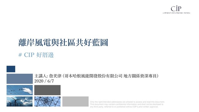 this document. This document may contain confidential information and shall not be disclosed to any third party, referred to or published without CIP’s prior written approval. 離岸風電與社區共好藍圖 # CIP 好厝邊 主講人: 詹羑律 (哥本哈根風能開發股份有限公司 地方關係資深專員) 2020 / 6/7