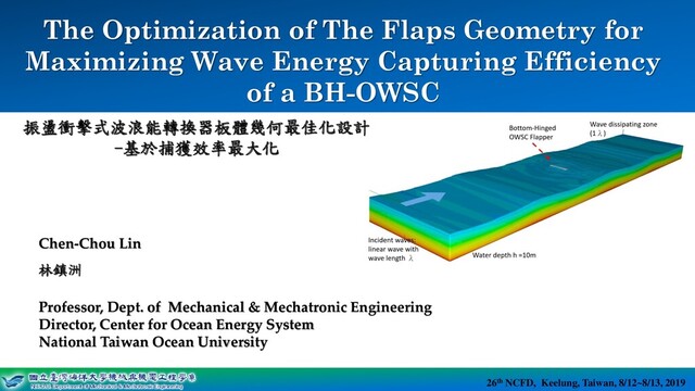 System 26th NCFD, Keelung, Taiwan, 8/12~8/13, 2019 Center for Ocean Energy System Chen-Chou Lin 林鎮洲 Professor, Dept. of Mechanical & Mechatronic Engineering Director, Center for Ocean Energy System National Taiwan Ocean University The Optimization of The Flaps Geometry for Maximizing Wave Energy Capturing Efficiency of a BH-OWSC 26th NCFD, Keelung, Taiwan, 8/12~8/13, 2019 振盪衝擊式波浪能轉換器板體幾何最佳化設計 -基於捕獲效率最大化