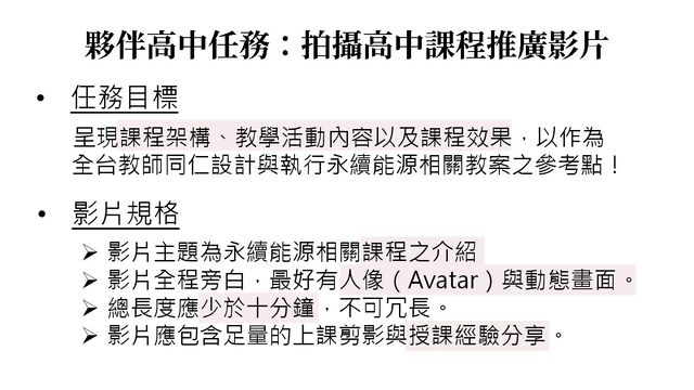 ➢ 影片主題為永續能源相關課程之介紹 ➢ 影片全程旁白,最好有人像(Avatar)與動態畫面。 ➢ 總長度應少於十分鐘,不可冗長。 ➢ 影片應包含足量的上課剪影與授課經驗分享。 • 任務目標