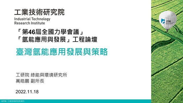 總減碳量約37百萬公噸(發電15百萬噸、工業20百萬噸、載具2百萬噸) 臺灣2050氫氨需求及供給初步評估 集中式發電 (238萬噸, 98.8%) 分散式發電 (3萬噸, 1.2%) 發電應用 241萬噸 工業應用 176萬噸 載具應用 18萬噸 100 200 發 電 工 業 工研院 2022.06 盤點規劃 載 具 300 ( 萬 噸 / 年 ) 需 求 量 發電應用 315萬噸 400 氨氣 氫氣 500 進口氫氣 (325萬噸, 75%) 自產氫氣 (110萬噸, 25%) 註1:本預估以國發會發佈2050淨零排放路徑 之氫需求為基礎進行推算 註2:自產氫氣初步評估約110萬噸,初估自 產綠氫70%、藍氫30% 。未來需視綠 電、碳捕獲封存再利用(CCUS)發展 而滾動調整 大貨車 (12.2萬噸, 66.3%) 小貨車 (1.4萬, 7.6%) 小客車 (3.3萬噸, 17.9%) 堆高機 (0.1萬噸, 0.5%) 大客車 (1.4萬噸, 7.6%) 煉鋼 (74萬噸,42%) 煉油 (48萬噸,27.3%) 碳循環 (41萬噸,23.3%) 電子業 (5萬噸,2.8%) 石化製程燃料 (8.4萬噸,4.6%)