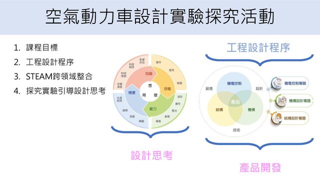 空氣動力車設計實驗探究活動 1. 課程目標 2. 工程設計程序 3. STEAM跨領域整合 4. 探究實驗引導設計思考 設計思考