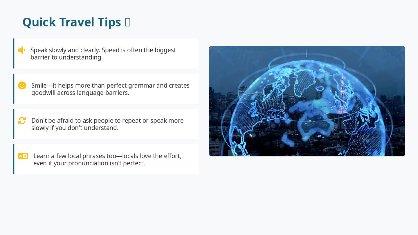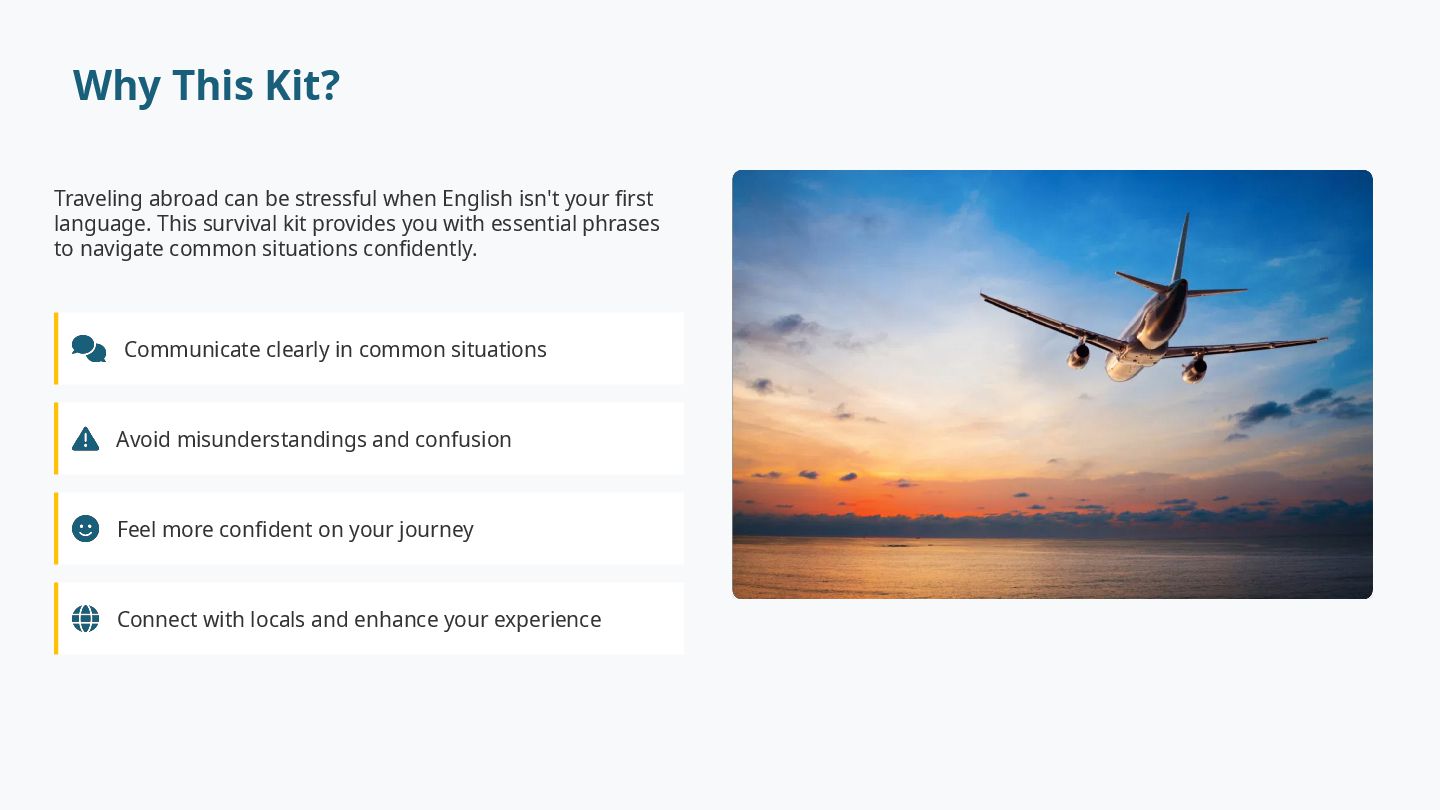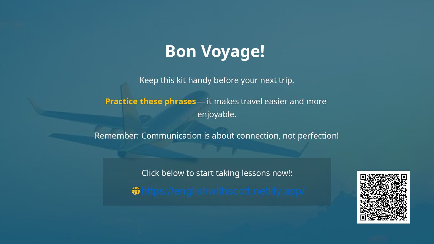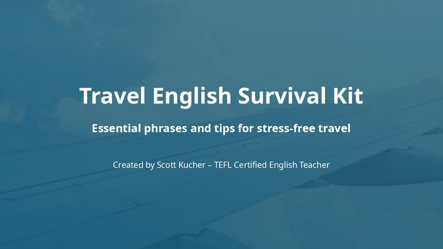 Free ESL/TEFL lesson plan with English travel phrases for beginners. Practice real conversations for airports, hotels, restaurants, transportation, emergencies, and small talk. This survival kit includes ready-made speaking activities, cultural tips, and useful expressions to help learners travel confidently. Perfect for English learners, travelers preparing for trips, and TEFL teachers who want ready-to-use English lesson materials. Great for self-study, tutoring, or classroom teaching.