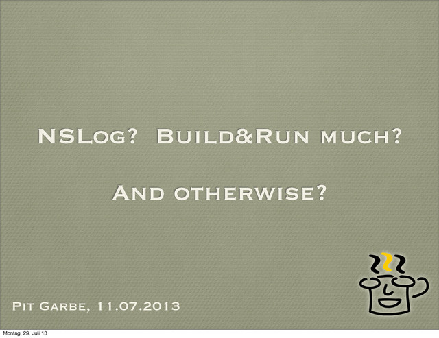 was NSLog, or more advanced: CocoaLumberjack (DDLog) • to log something different, you’d often have to build and run • to log UI stuff, you’d have to write inconvenient, long log statements, that are hard to read in code as well as in their output • sometimes quite useless (debugging graphics with text??) Montag, 29. Juli 13