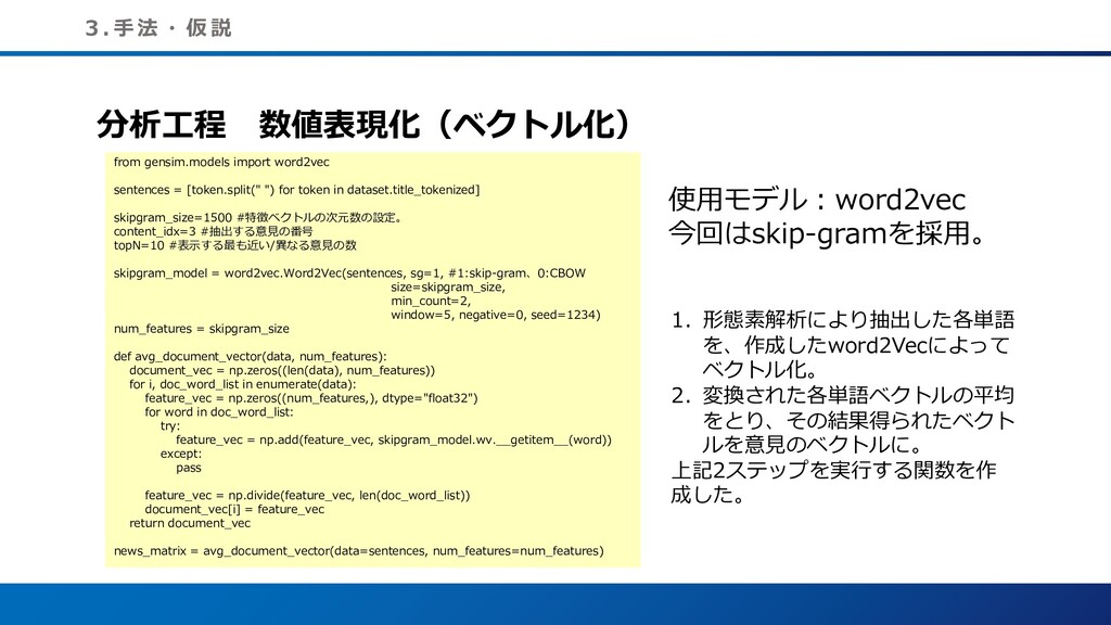 [token.split(" ") for token in dataset.title_tokenized] skipgram_size=1500 #特徴ベクトルの次元数の設定。 content_idx=3 #抽出する意⾒の番号 topN=10 #表⽰する最も近い/異なる意⾒の数 skipgram_model = word2vec.Word2Vec(sentences, sg=1, #1:skip-gram、0:CBOW size=skipgram_size, min_count=2, window=5, negative=0, seed=1234) num_features = skipgram_size def avg_document_vector(data, num_features): document_vec = np.zeros((len(data), num_features)) for i, doc_word_list in enumerate(data): feature_vec = np.zeros((num_features,), dtype="float32") for word in doc_word_list: try: feature_vec = np.add(feature_vec, skipgram_model.wv.__getitem__(word)) except: pass feature_vec = np.divide(feature_vec, len(doc_word_list)) document_vec[i] = feature_vec return document_vec news_matrix = avg_document_vector(data=sentences, num_features=num_features) 1. 形態素解析により抽出した各単語 を、作成したword2Vecによって ベクトル化。 2. 変換された各単語ベクトルの平均 をとり、その結果得られたベクト ルを意⾒のベクトルに。 上記2ステップを実⾏する関数を作 成した。 3 . ⼿ 法 ・ 仮 説
