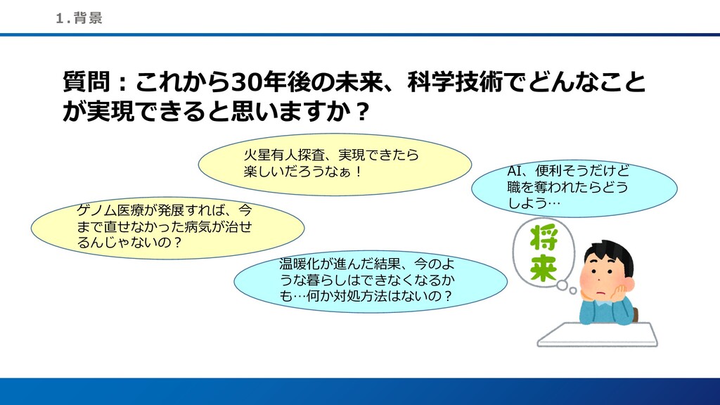 2. 質問︓これから30年後の未来、科学技術でどんなこと が実現できると思いますか︖ 1 . 背 景 ゲノム医療が発展すれば、今 まで直せなかった病気が治せ るんじゃないの︖ ⽕星有⼈探査、実現できたら