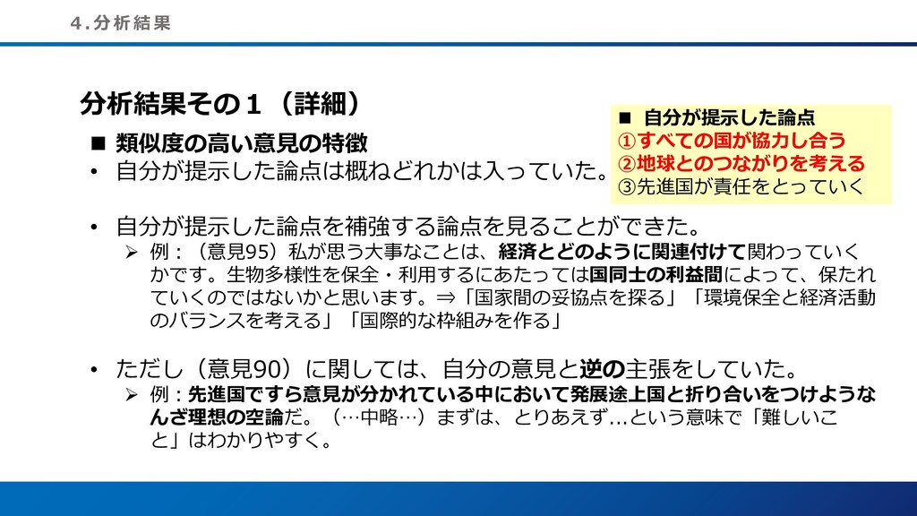 ⾃分が提⽰した論点を補強する論点を⾒ることができた。 Ø 例︓(意⾒95)私が思う⼤事なことは、経済とどのように関連付けて関わっていく かです。⽣物多様性を保全・利⽤するにあたっては国同⼠の利益間によって、保たれ ていくのではないかと思います。⇒「国家間の妥協点を探る」「環境保全と経済活動 のバランスを考える」「国際的な枠組みを作る」 • ただし(意⾒90)に関しては、⾃分の意⾒と逆の主張をしていた。 Ø 例︓先進国ですら意⾒が分かれている中において発展途上国と折り合いをつけような んざ理想の空論だ。(…中略…)まずは、とりあえず...という意味で「難しいこ と」はわかりやすく。 分析結果その1(詳細) 4 . 分 析 結 果