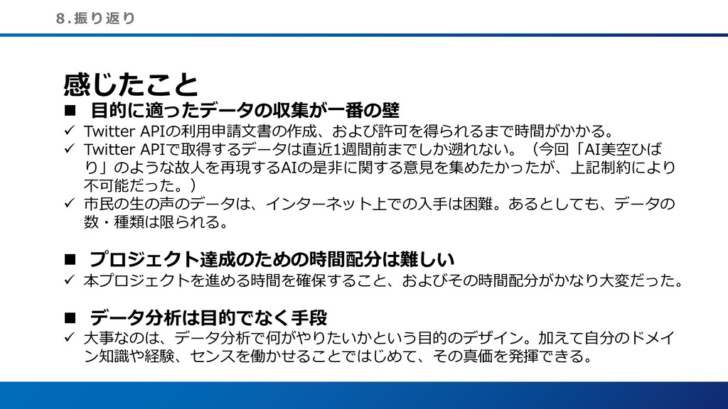 Twitter APIの利⽤申請⽂書の作成、および許可を得られるまで時間がかかる。 ü Twitter APIで取得するデータは直近1週間前までしか遡れない。(今回「AI美空ひば り」のような故⼈を再現するAIの是⾮に関する意⾒を集めたかったが、上記制約により 不可能だった。) ü 市⺠の⽣の声のデータは、インターネット上での⼊⼿は困難。あるとしても、データの 数・種類は限られる。 n プロジェクト達成のための時間配分は難しい ü 本プロジェクトを進める時間を確保すること、およびその時間配分がかなり⼤変だった。 n データ分析は⽬的でなく⼿段 ü ⼤事なのは、データ分析で何がやりたいかという⽬的のデザイン。加えて⾃分のドメイ ン知識や経験、センスを働かせることではじめて、その真価を発揮できる。