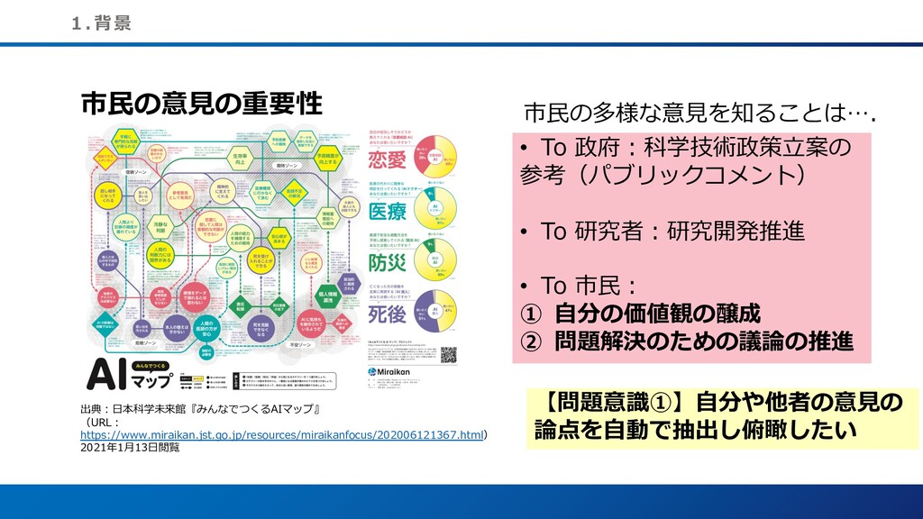 市⺠︓ ① ⾃分の価値観の醸成 ② 問題解決のための議論の推進 出典︓⽇本科学未来館『みんなでつくるAIマップ』 (URL︓ https://www.miraikan.jst.go.jp/resources/miraikanfocus/202006121367.html) 2021年1⽉13⽇閲覧 【問題意識①】⾃分や他者の意⾒の 論点を⾃動で抽出し俯瞰したい 市⺠の多様な意⾒を知ることは…. 1 . 背 景