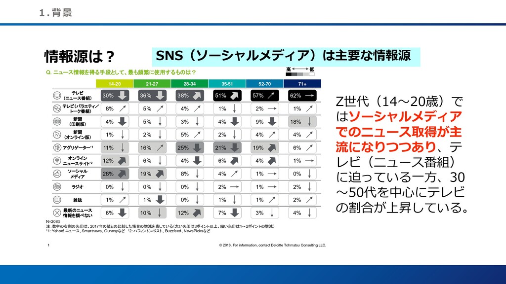 1 Q. ニュース情報を得る手段として、最も頻繁に使用するものは? Z世代ではソーシャルメディアでのニュース取得が主流になりつつあり、テレビ(ニュー ス番組)に迫っている一方、30~50代を中心にテレビの割合が上昇している 高 低 N=2083 注:数字の右側の矢印は、2017年の値との比較した場合の増減を表している(太い矢印は3ポイント以上、細い矢印は1~2ポイントの増減) *1:Yahoo! ニュース、Smartnews、Gunosyなど *2:ハフィントンポスト、Buzzfeed、NewsPicksなど 14-20 21-27 28-34 35-51 52-70 71+ テレビ (ニュース番組) 51% 57% 38% 30% 62% 36% 雑誌 1% 1% 0% 1% 2% 1% ソーシャル メディア 4% 1% 8% 28% 0% 19% 新聞 (印刷版) 4% 9% 3% 4% 18% 5% オンライン ニュースサイト*2 6% 4% 4% 12% 1% 6% 新聞 (オンライン版) 2% 4% 5% 1% 4% 2% ラジオ 2% 1% 0% 0% 2% 0% 最新のニュース 情報を調べない 7% 3% 12% 6% 4% 10% テレビ(バラエティ/ トーク番組) 1% 2% 4% 8% 1% 5% 21% 19% 25% アグリゲーター*1 11% 6% 16% Z世代(14〜20歳)で はソーシャルメディア でのニュース取得が主 流になりつつあり、テ レビ(ニュース番組) に迫っている⼀⽅、30 〜50代を中⼼にテレビ の割合が上昇している。 SNS(ソーシャルメディア)は主要な情報源 1 . 背 景