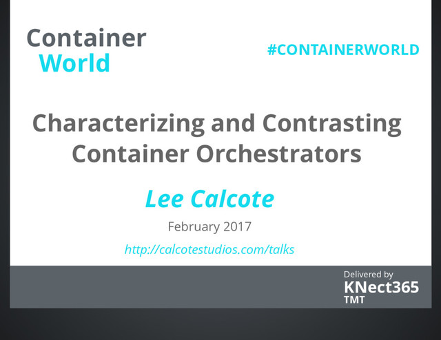 (June 2014) Announced as production-ready 19 months ago (July 2015) Project has over 1,000 commits per month (~44,000 total) reach 1,000 committers (~100 core) Kubernauts in Dec. 2016 ~5,000 commits made in each release (1.5 is latest) ~244 Kubernetes meetups worldwide. Disclaimer: I organize Microservices and Containers Austin. Under the governance of the Cloud Native Computing Foundation KubeCon earlier this year capped at 1,000 attendees @lcalcote