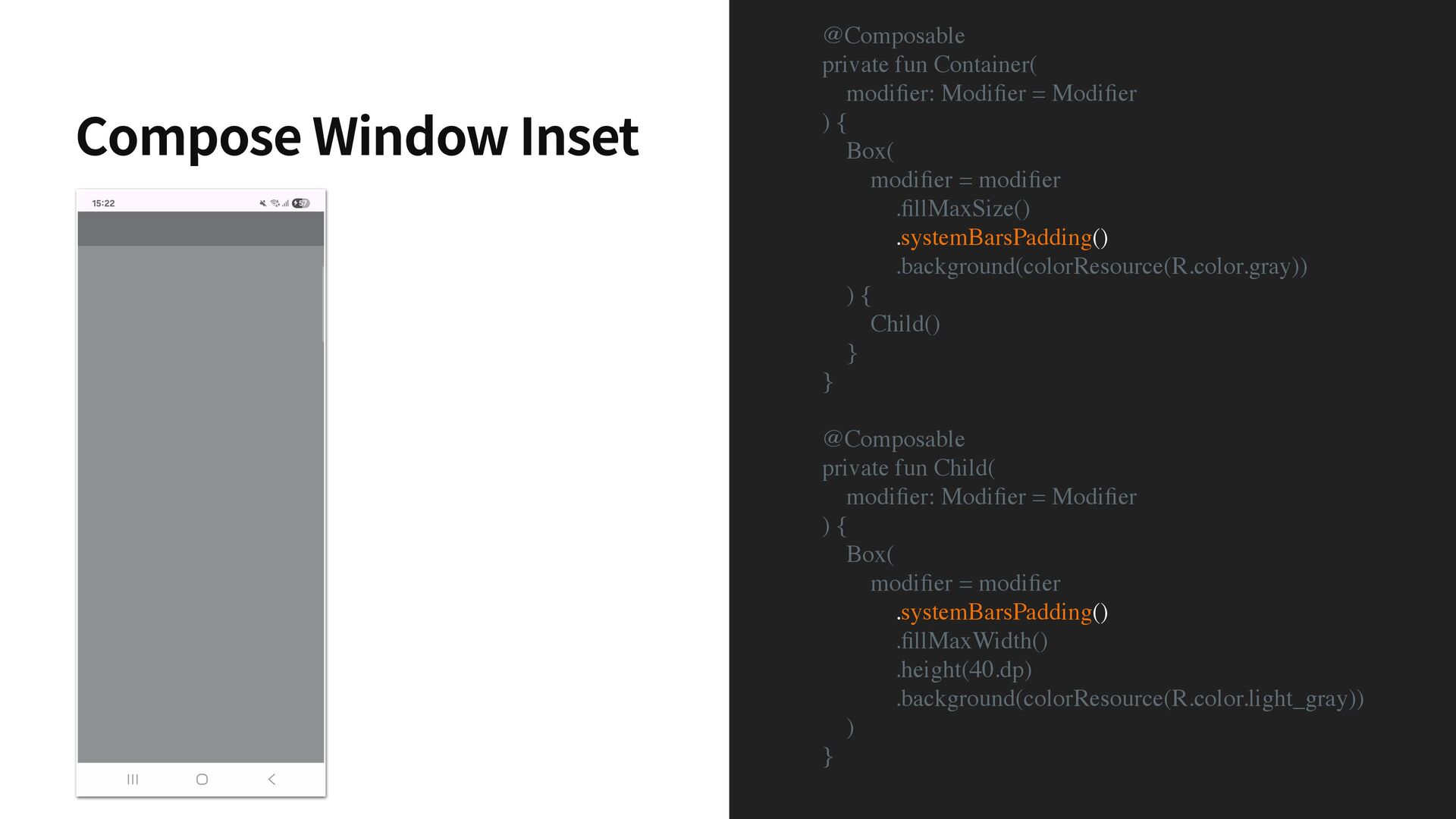 = Modi fi er ) { Box( modi fi er = modi fi er . fi llMaxSize() .systemBarsPadding() .background(colorResource(R.color.gray)) ) { Child() } } @Composable private fun Child( modi fi er: Modi fi er = Modi fi er ) { Box( modi fi er = modi fi er .systemBarsPadding() . fi llMaxWidth() .height(40.dp) .background(colorResource(R.color.light_gray)) ) } Compose Window Inset