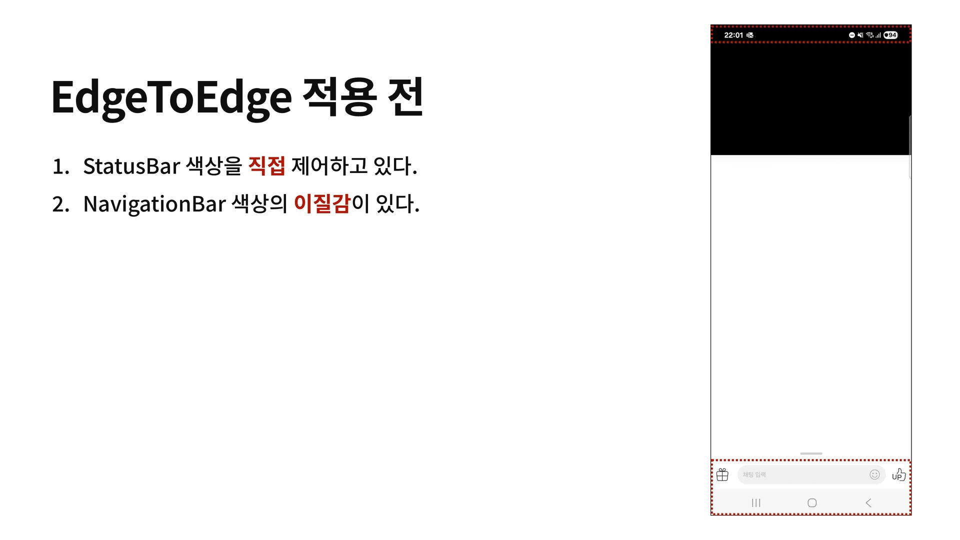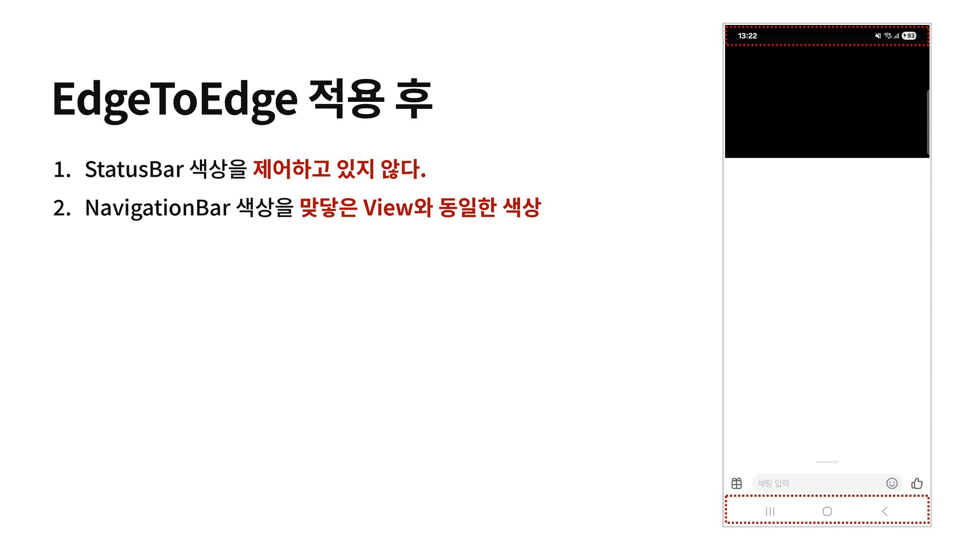 insets.getInsets( WindowInsetsCompat.Type.systemBars() or WindowInsetsCompat.Type.displayCutout() ) v.updateMargin( top = sysBars.top, bottom = sysBars.bottom, start = v.marginStart, end = v.marginEnd ) WindowInsetsCompat.CONSUMED } 1 .StatusBar랑 Cutout은 거의 겹쳐 있다. 2 . Cutout 은 hide/show 개념이 아니다.