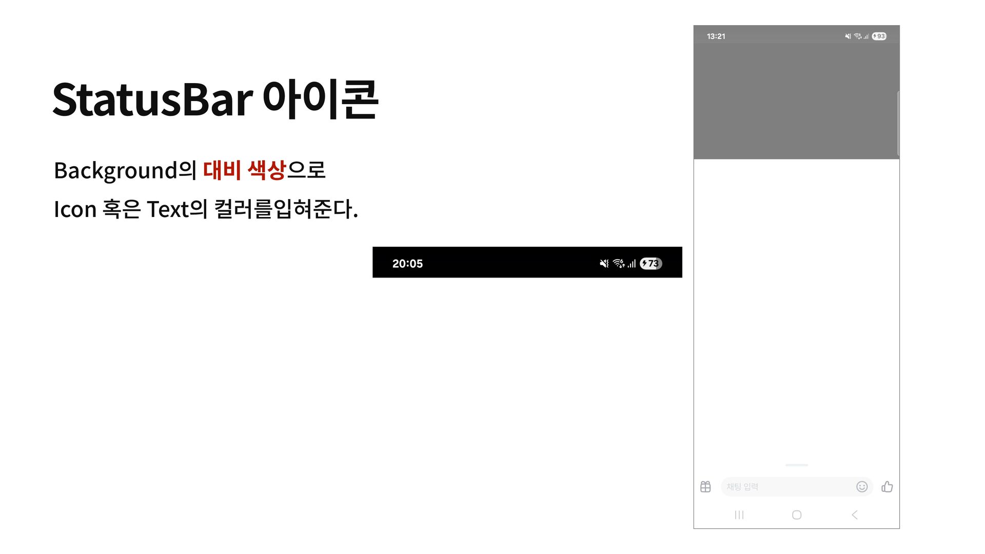 of the status bars * to light so that the items on the bar can be read clearly. * If false, reverts to the default appearance. */ fun setAppearanceLightStatusBars(isLight: Boolean) { mImpl.setAppearanceLightStatusBars(isLight) } StatusBar 아이콘 혹은 텍스트의 색상을 변경 - true -> 어두운 색상 - false -> 밝은 색상