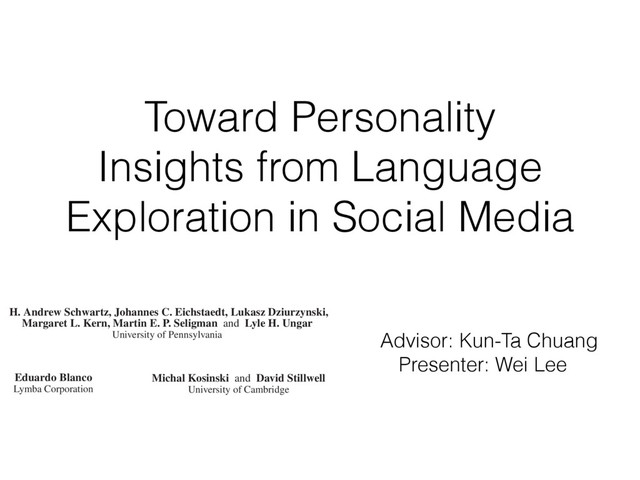 most correlated with females (top) and males (bottom), adjusted for age ( N = 74 , 941: 46 , 572 females and 28 , 369 males; Bonferroni-corrected p < 0 . 001). Size of words indicates the strength of the correlation; color indicates relative frequency of usage. Underscores ( ) connect words in multiword phrases. hensive view, we prune features from the word cloud which contain overlap in information so that other significant fea- tures may fit. Specifically, using inverse-frequency as proxy for information content (Resnik 1999), we only include an ngram if it contains at least one word which is more infor- mative than previously seen words. For example, if ‘day’ correlates most highly but ‘beautiful day’ and ‘the day’ also correlate but less significantly, then ‘beautiful day’ would remain because ‘beautiful’ is adding information while ‘the day’ would be dropped because ‘the’ is less informative than ‘day’. We believe a differential word cloud representation is helpful to get an overall view of a given variable, function- ing as a supplement to a definition (i.e. what does it mean to be neurotic in Figure 3). Standardized frequency plot: standardized relative fre- quency of a feature over a continuum. It is often useful to track language features across a sequential variable such as age. We plot the standardized relative frequency of a lan- guage feature as a function of the outcome variable. In this case, we group age data in to bins of equal size and fit second-order LOESS regression lines (Cleveland 1979) to the age and language frequency data over all users. We adjust for gender by averaging male and female results. While we believe these visualizations are useful to demonstrate the insights one can gain from differential lan- guage analysis, the possibilities for other visualization are quite large. We discuss a few other visualization options we are also working on in the final section of this paper. Results We first present the n-grams that distinguish gender, then proceed to the more subtle task of examining the traits of personality, and last to exploring variations in topic use with age. Gender Figure 2 presents age-adjusted differential word clouds for females and males. Since gender is a familiar variable, it functions as a nice proof of concept for the anal- ysis. In agreement with past studies (Mulac, Studley, and Blau 1990; Thomson and Murachver 2001; Newman et al. 2008), we see many n-grams related to emotional and so- cial processes for females (e.g. ‘excited’, ‘love you’, ‘best friend’) while males mention more swear words and ob- ject references (e.g. ‘shit’, ‘Xbox’, ‘Windows 7’). We also contradict past studies, finding, for example, that males use fewer emoticons than females, contrary to a previous study of 100 bloggers (Huffaker and Calvert 2005). Also worth noting is that while ‘husband’ and ‘boyfriend’ are most dis- tinguishing for females, males prefer to attach the possessive modifier to those they are in relationships with: ‘my wife’ or ‘my girlfriend’. Personality Figure 3 shows the most distinguishing n- grams for extraverts versus introverts, as well as neurotic versus emotionally stable (word clouds for the other person- ality factors are in the appendix). Consistent with the defi- nition of the personality traits (McCrae and John 1992), ex- traverts mention social n-grams such as ‘love you’, ‘party’, ‘boys’, and ‘ladies’, while introverts mention solitary ac- tivities such as ‘Internet’, ‘read’, and ‘computer’. Moving beyond expected results, we also see a few novel insights, 75 Figure 3: A. N-grams most distinguishing extraversion (top, e.g., ‘party’) from introversion (bottom, e.g., ‘computer’). B. N-grams most distinguishing neuroticism (top, e.g. ‘hate’) from emotional stability (bottom, e.g., ‘blessed’) ( N = 72 , 791 for extraversion; N = 72 , 047 for neuroticism; adjusted for age and gender; Bonferroni-corrected p < 0 . 001). Results for openness, conscientiousness, and agreeableness can be found on our website, wwbp.org. such as the preference of introverts for Japanese culture (e.g. ‘anime’, ‘pokemon’, and eastern emoticons ‘ > . < ’ and ’^ ^’). A similar story can be found for neuroticism with expected results of ‘depression’, ‘sick of’, and ‘I hate’ ver- sus ‘success’, ‘a blast’, and ‘beautiful day’. 6 More surpris- ingly, sports and other activities are frequently mentioned by those low in neuroticism: ‘backetball’, ‘snowboarding’, ‘church’, ‘vacation’, ‘spring break’. While a link between a variety of life activities and emotional stability seems rea- sonable, to the best of our knowledge such a relationship has never been explored (i.e. does participating in more activi- ties lead to a more emotionally stable life, or is it only that those who are more emotionally stable like to participate in more activities?). This demonstrates how open-vocabulary hand, classes, going back to school, laughing, and young re- lationships while 23 to 29 year olds mention topics related to job search, work, drinking, household chores, and time management. Additionally, we show n-gram and topic use across age in standardized frequency plots of Figure 5. One can follow peaks for the predominant topics of school, col- lege, work, and family across the age groups. We also see more psychologically oriented features, such as ‘I’ and ‘we’ decreasing until the early twenties and then ‘we’ monotoni- cally increasing from that point forward. One might expect ‘we’ to increase as people marry, but it continues increasing across the whole lifespan even as weddings flatten out. A similar result is seen in the social topics of Figure 5B. Figure 4: A. N-grams and topics most distinguishing volunteers aged 13 to 18. B. N-grams and topics most distinguishing