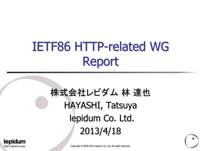 Applications Area概要 主にアプリケーション層に属する事象を扱う 現在15のアクティブなWGが存在 appsawg Applications Area Working Group core Constrained RESTful Environments httpbis Hypertext Transfer Protocol Bis paws Protocol to Access WS database precis Preparation and Comparison of Internationalized Strings scim System for Cross-domain Identity Management websec Web Security weirds Web Extensible Internet Registration Data Service (hybi BiDirectional or Server-Initiated HTTP) (jcardcal JSON data formats for vCard and iCalendar) (repute Reputation Services) (spfbis SPF Update) (urnbis Uniform Resource Names, Revised) ※括弧書きは今回Meetingが開催されていないWG