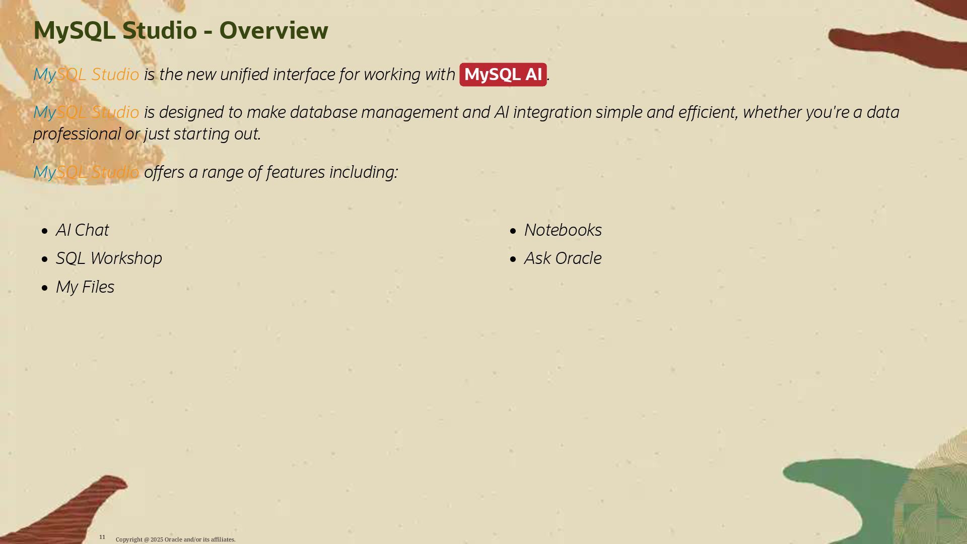 All components are orchestrated through the new MySQL Studio, providing a unified interface for data preparation, model management, and AI-assisted query development.