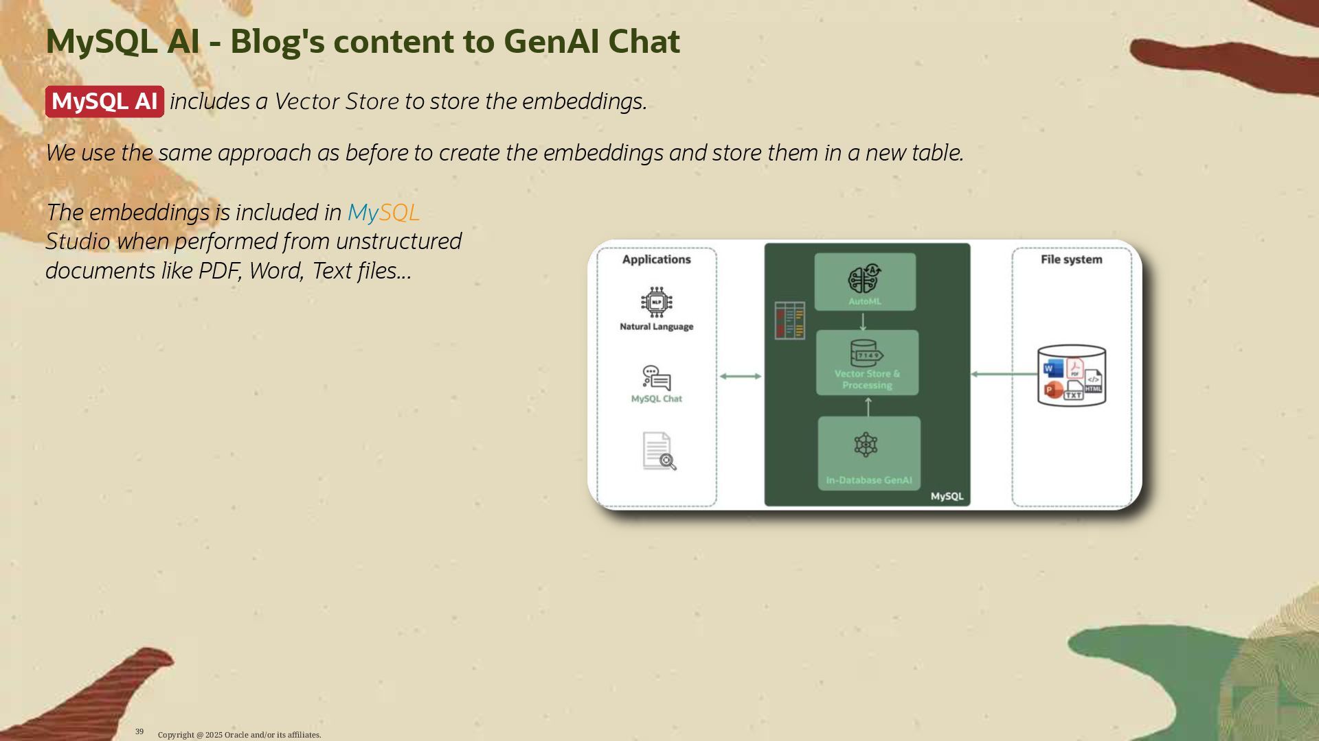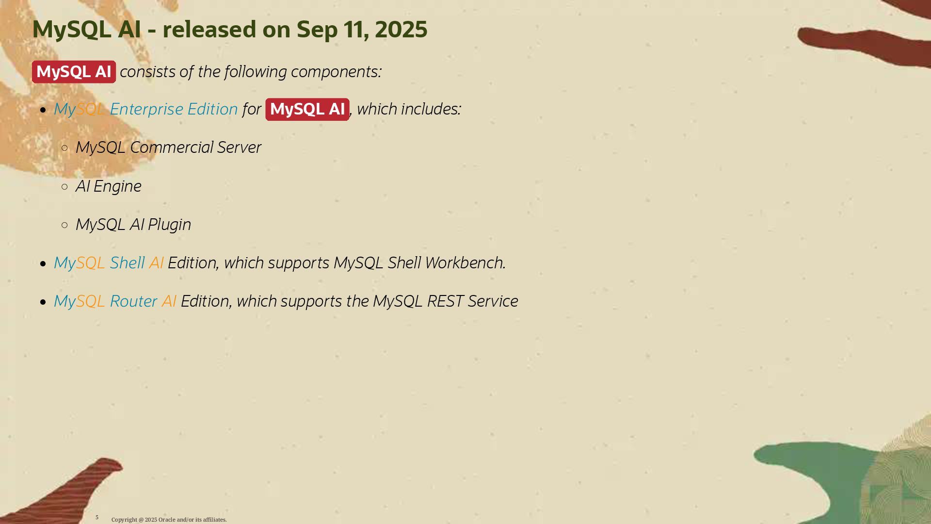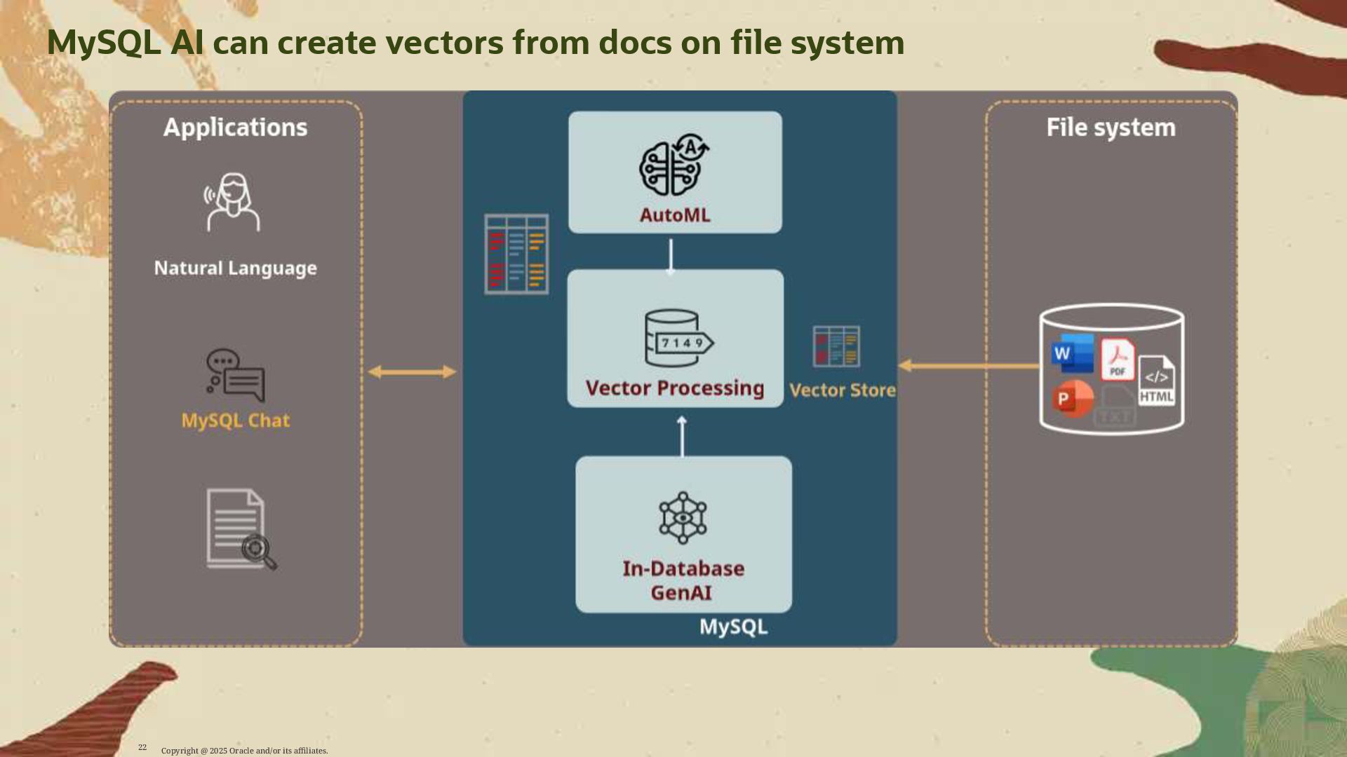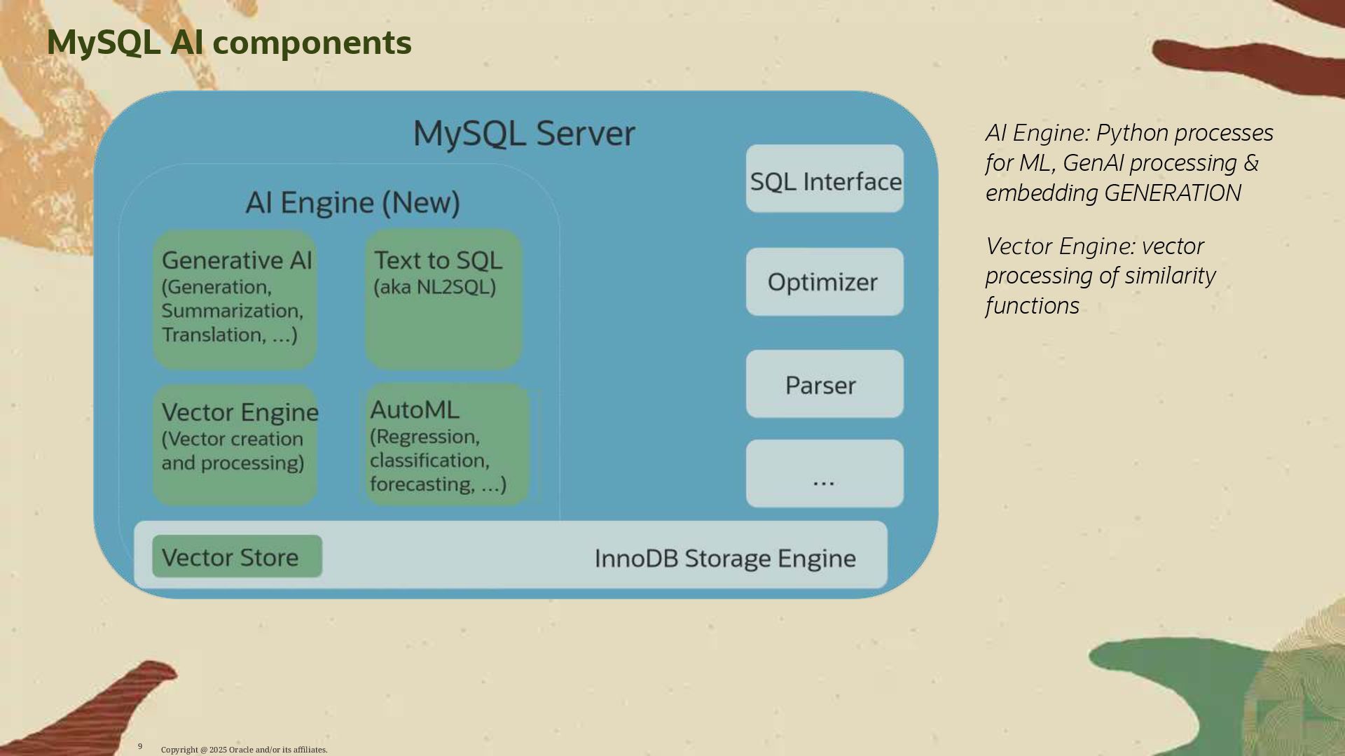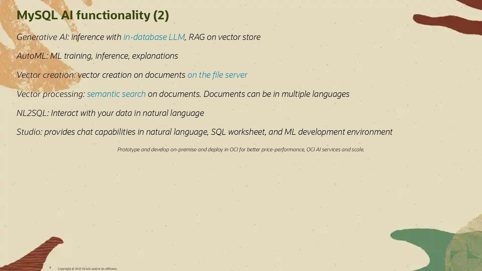 - Deploy AI-driven features — such as semantic search and contextual data enrichment — natively inside MySQL
