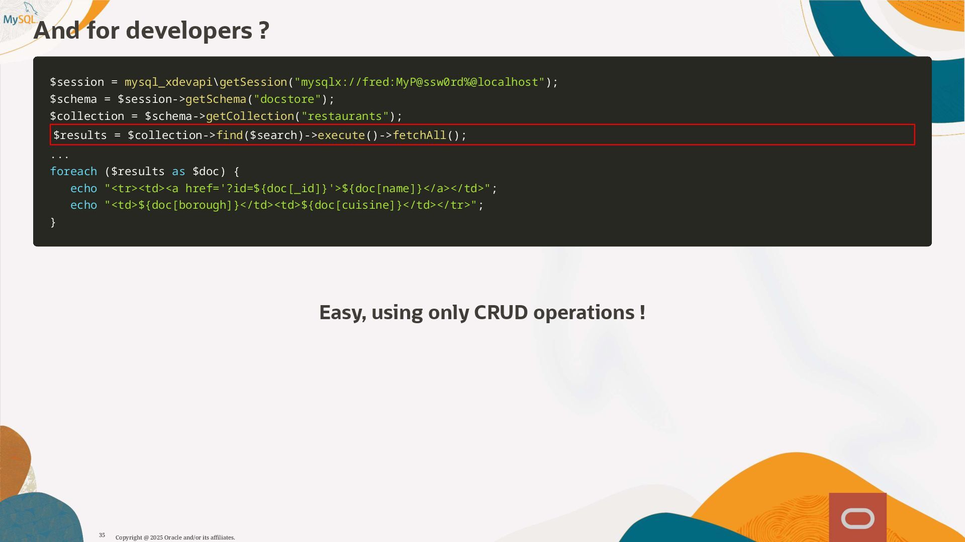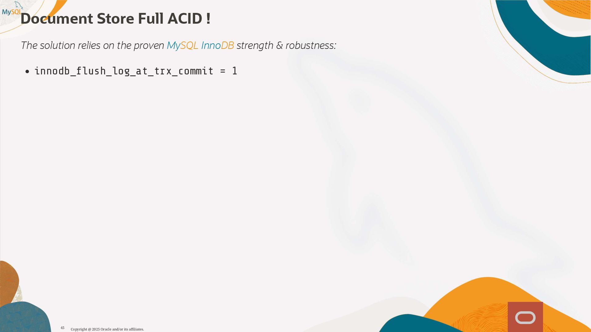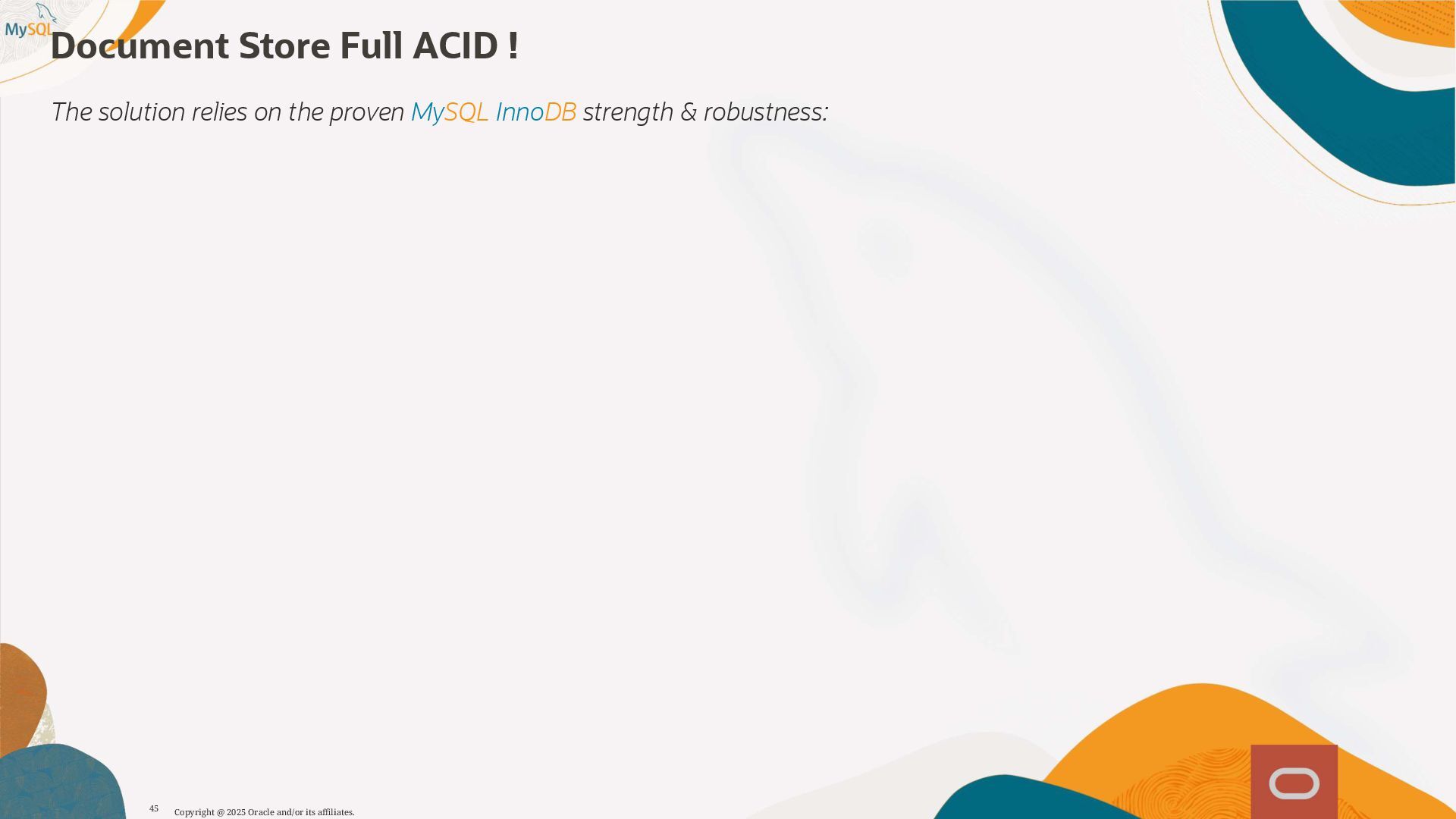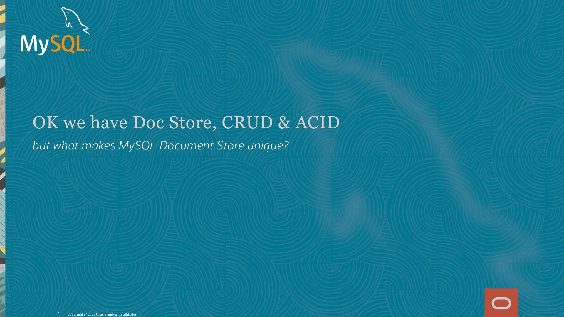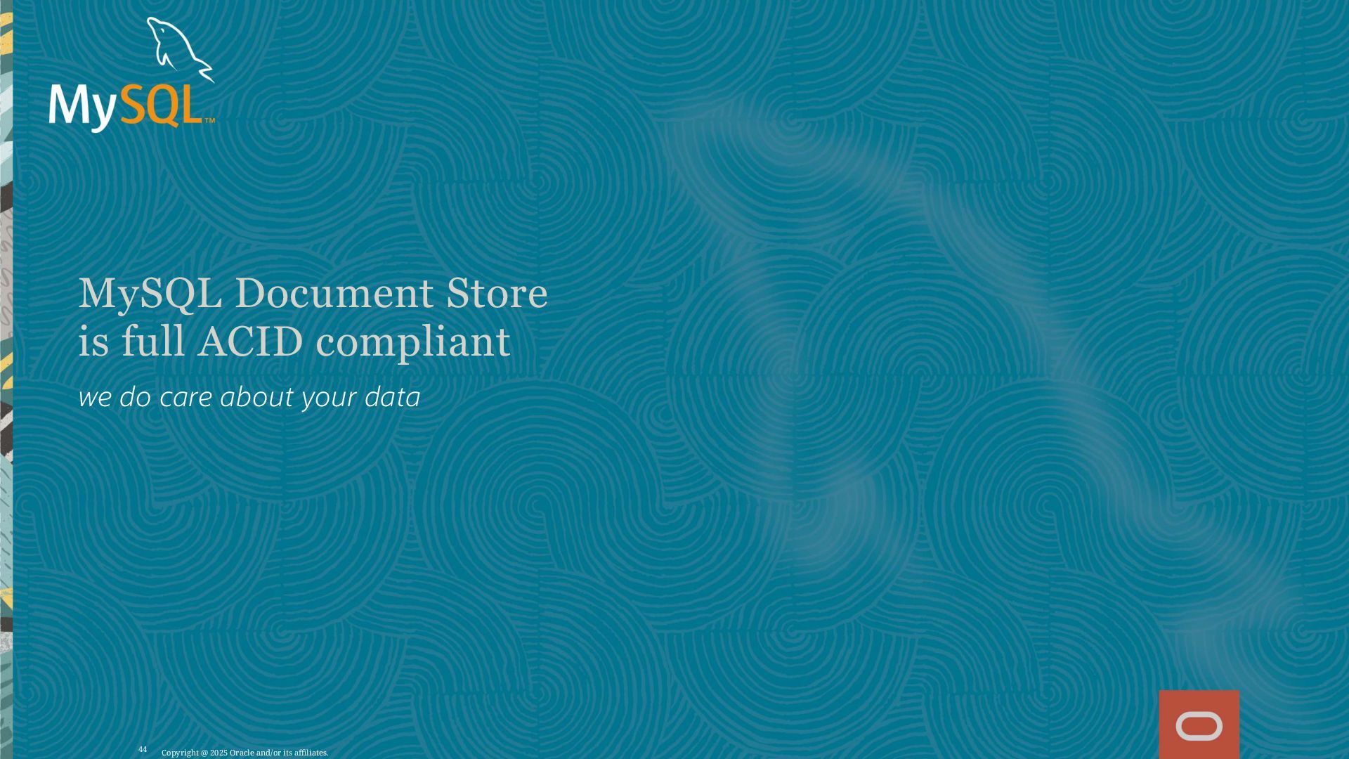 Join this session to discover how MySQL, thanks to the X dev API, allows you to store and manage JSON documents like any other Document Store.