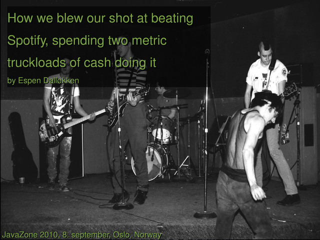 our shot at beating Spotify, spending two metric Spotify, spending two metric truckloads of cash doing it truckloads of cash doing it by Espen Dalløkken by Espen Dalløkken JavaZone 2010, 8. september, Oslo, Norway JavaZone 2010, 8. september, Oslo, Norway