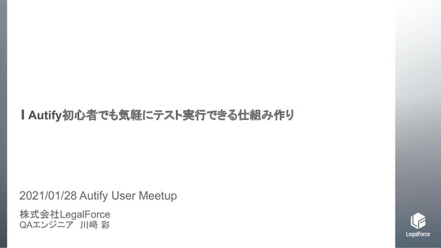 Autify初心者でも気軽にテスト実行できる仕組み作り 株式会社LegalForce QAエンジニア 川﨑 彩 LegalForceとMarshallのご紹介 2021/01/28 Autify User Meetup 1