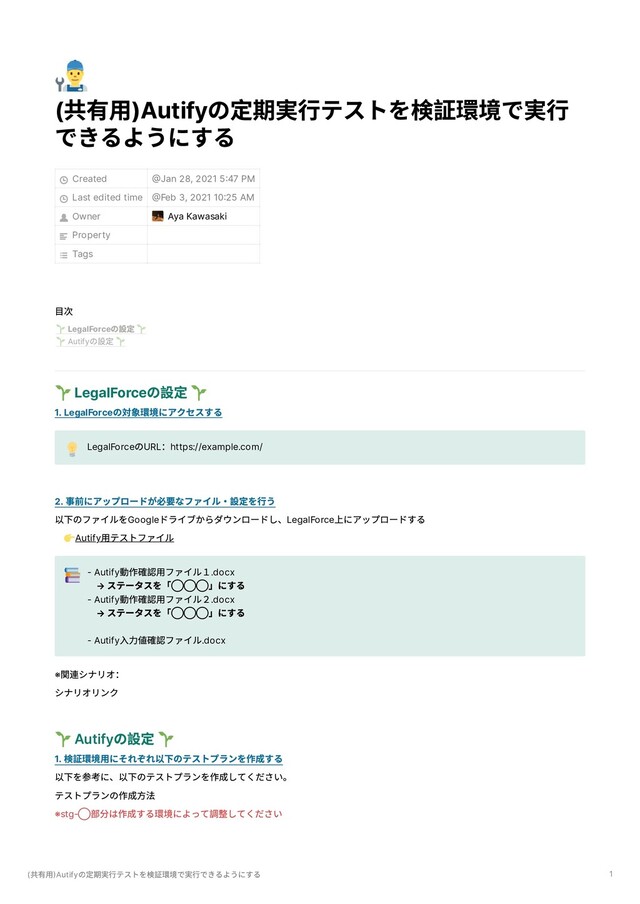 edited time Owner Aya Kawasaki Property Tags ⽬次 🌱 LegalForce の設定 🌱 1. LegalForce の対象環境にアクセスする 💡 LegalForce のURL :https://example.com/ 2. 事前にアップロードが必要なファイル・設定を⾏う 以下のファイルをGoogle ドライブからダウンロードし、LegalForce 上にアップロードする 👉Autify ⽤テストファイル 📚 - Autify 動作確認⽤ファイル1.docx → ステータスを「◯◯◯ 」にする - Autify 動作確認⽤ファイル2.docx → ステータスを「◯◯◯ 」にする - Autify ⼊⼒値確認ファイル.docx ※ 関連シナリオ: シナリオリンク 🌱 Autify の設定 🌱 1. 検証環境⽤にそれぞれ以下のテストプランを作成する 以下を参考に、以下のテストプランを作成してください。 テストプランの作成⽅法 ※stg-◯ 部分は作成する環境によって調整してください Jan 28, 2021 547 PM Feb 3, 2021 1025 AM 🌱 LegalForce の設定 🌱 🌱 Autify の設定 🌱