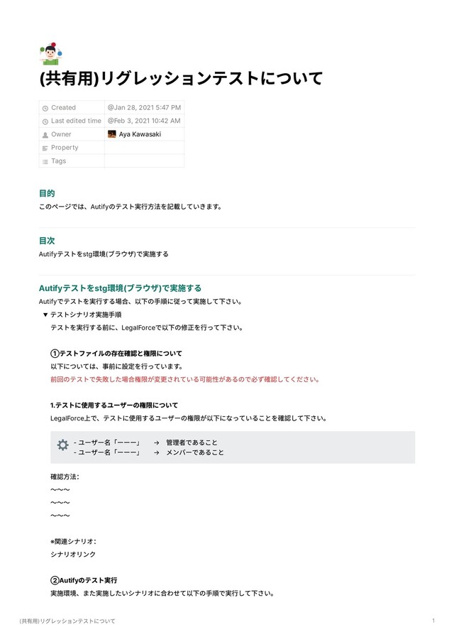 time Owner Aya Kawasaki Property Tags ⽬的 このページでは、Autify のテスト実⾏⽅法を記載していきます。 ⽬次 Autify テストをstg 環境( ブラウザ) で実施する Autify テストをstg 環境( ブラウザ) で実施する Autify でテストを実⾏する場合、以下の⼿順に従って実施して下さい。 テストシナリオ実施⼿順 テストを実⾏する前に、LegalForce で以下の修正を⾏って下さい。 ① テストファイルの存在確認と権限について 以下については、事前に設定を⾏っています。 前回のテストで失敗した場合権限が変更されている可能性があるので必ず確認してください。 1. テストに使⽤するユーザーの権限について LegalForce 上で、テストに使⽤するユーザーの権限が以下になっていることを確認して下さい。 ⚙ - ユーザー名「ーーー」 → 管理者であること - ユーザー名「ーーー」 → メンバーであること 確認⽅法: 〜〜〜 〜〜〜 〜〜〜 ※ 関連シナリオ: シナリオリンク ②Autify のテスト実⾏ 実施環境、また実施したいシナリオに合わせて以下の⼿順で実⾏して下さい。 Jan 28, 2021 547 PM Feb 3, 2021 1042 AM