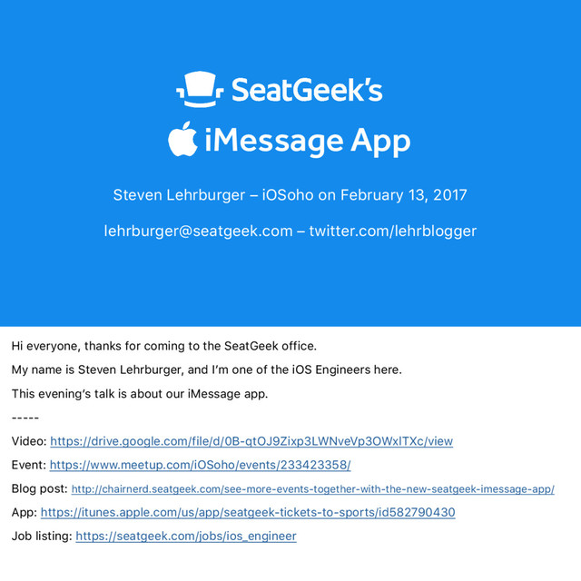 SeatGeek’s iMessage App takes the most social parts of the product and makes them available within the iOS Messages app. Users can search for events to discuss with their friends, and then send the tickets quickly and easily without the hassle of PDFs or printing. The app was written in Objective-C for a tight deadline, and you’ll hear about how we simplified existing features to optimize for both real-world usefulness and minimal development effort.