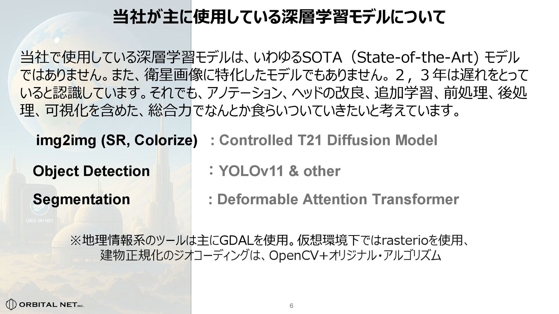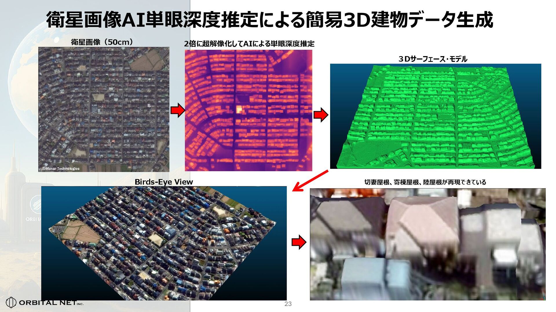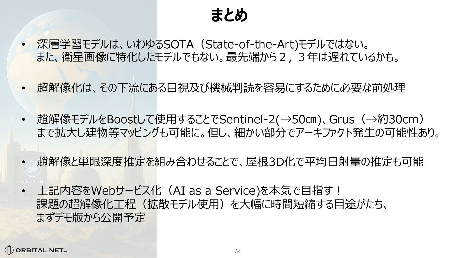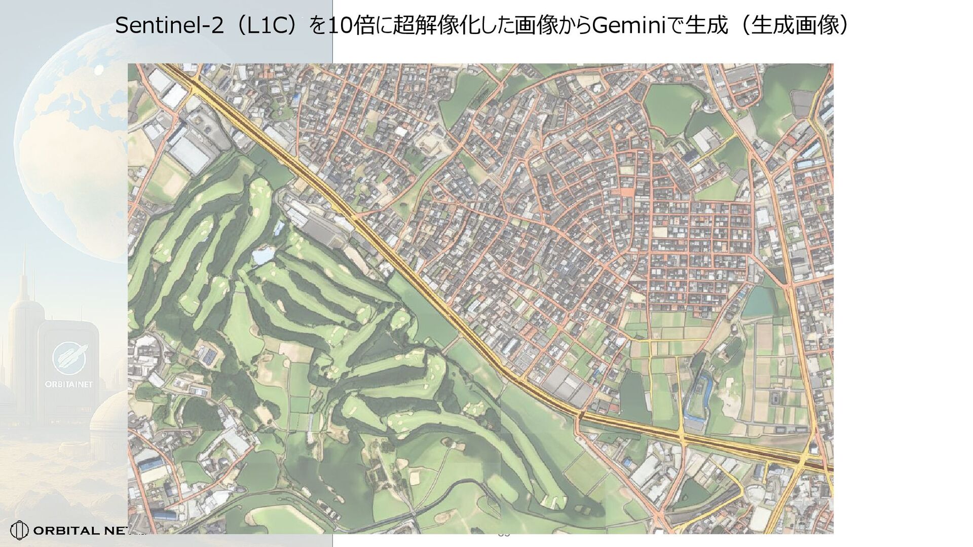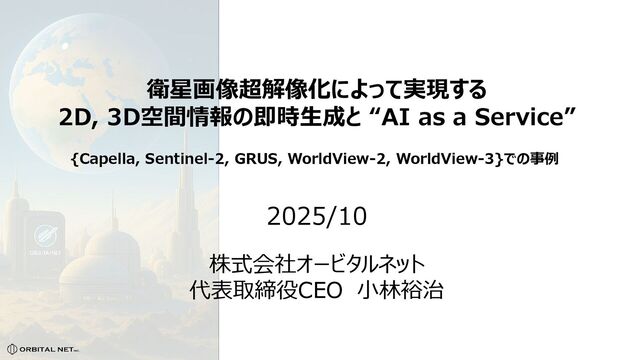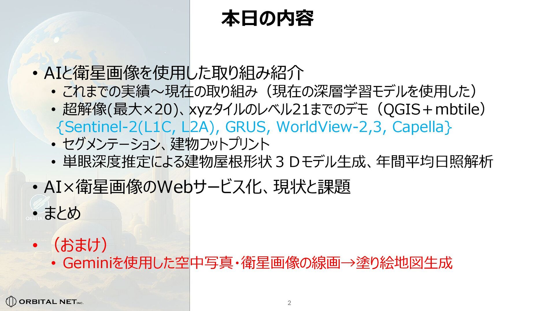 オービタルネットでは、様々な衛星画像を用いた地理空間情報の生成を行っています。本発表では、Capella(SAR), Sentinel-2, GRUS, WorldView-2, 3などさまざまな衛星画像を、拡散モデルベースの画像生成AIにより超(超)解像画像を生成したのち、2D(セグメンテーションとマスク正規化)及び3D(単眼深度推定=衛星画像からレーザー点群やDEMを用いず建物3Dモデルを生成)の地理空間情報を即時生成する取り組みをご紹介します。また、衛星画像の入力から地理空間情報の出力までをE2Eで実現する “AI as a Service” に向けた取り組みや、最近話題のS2DR3やDINOv3等の衛星画像解析のSOTAモデルについても触れたいと考えます。