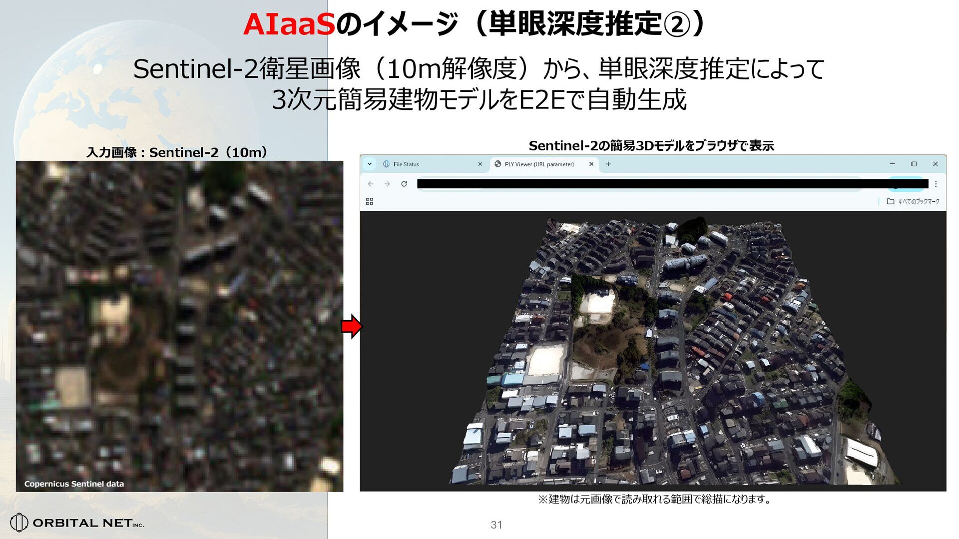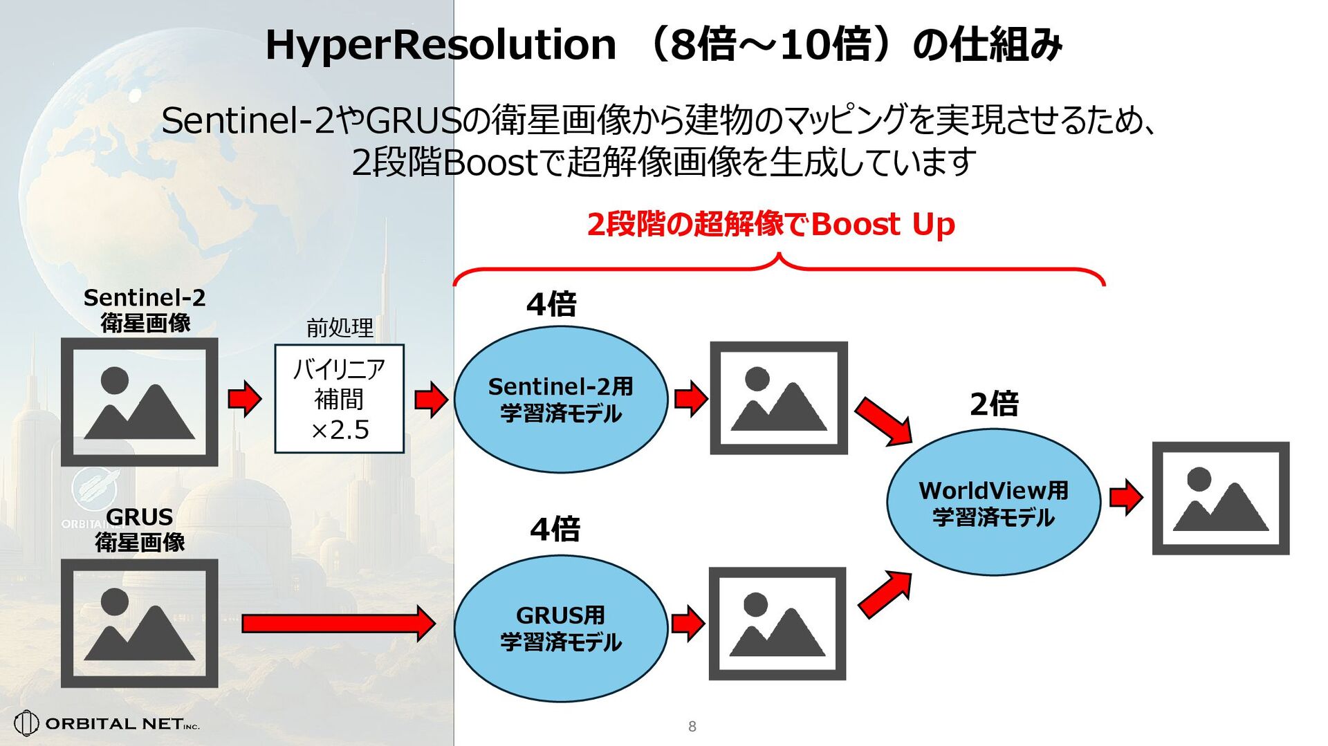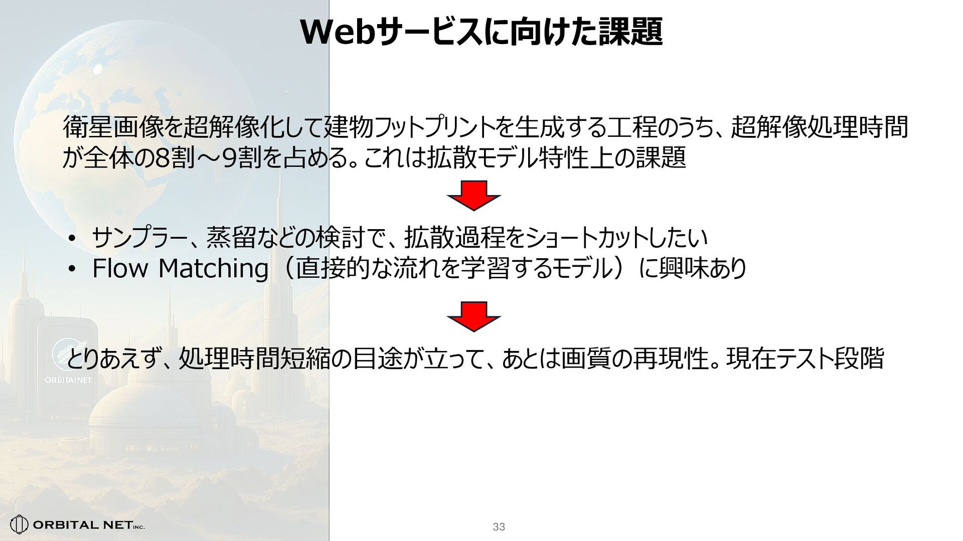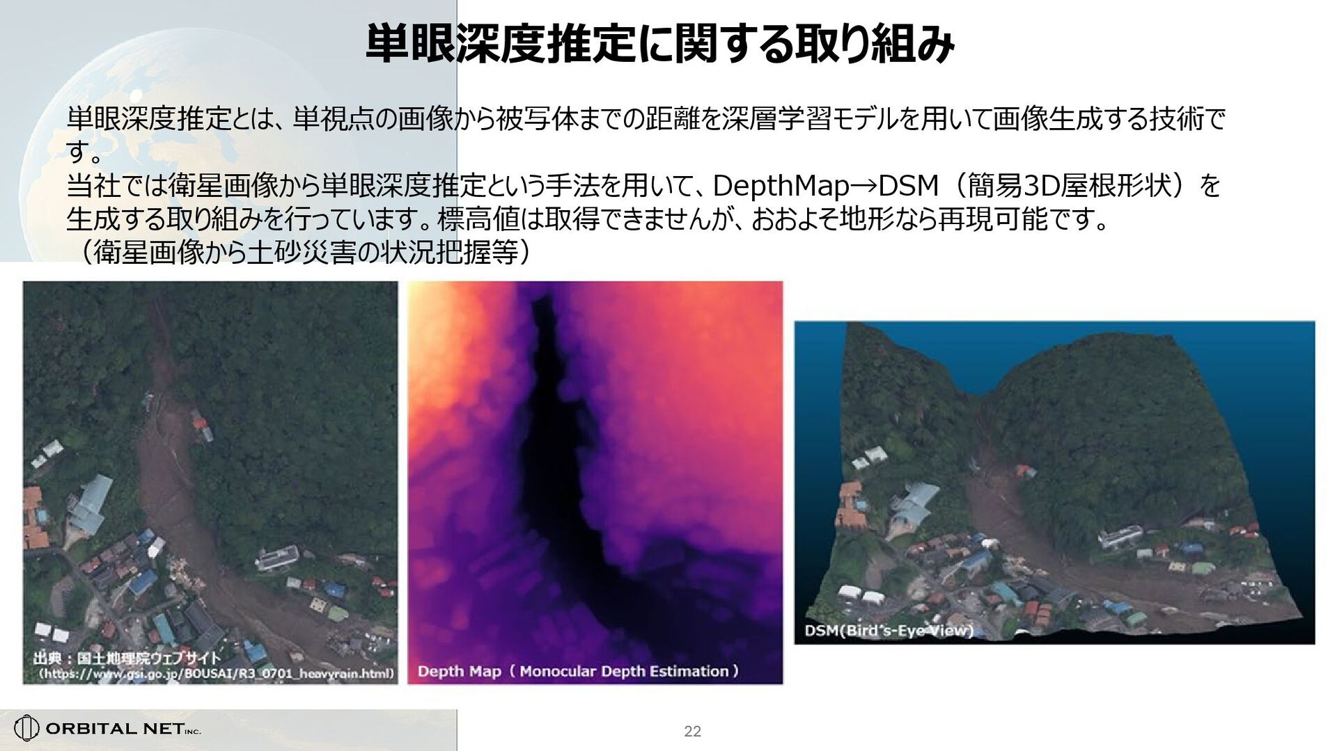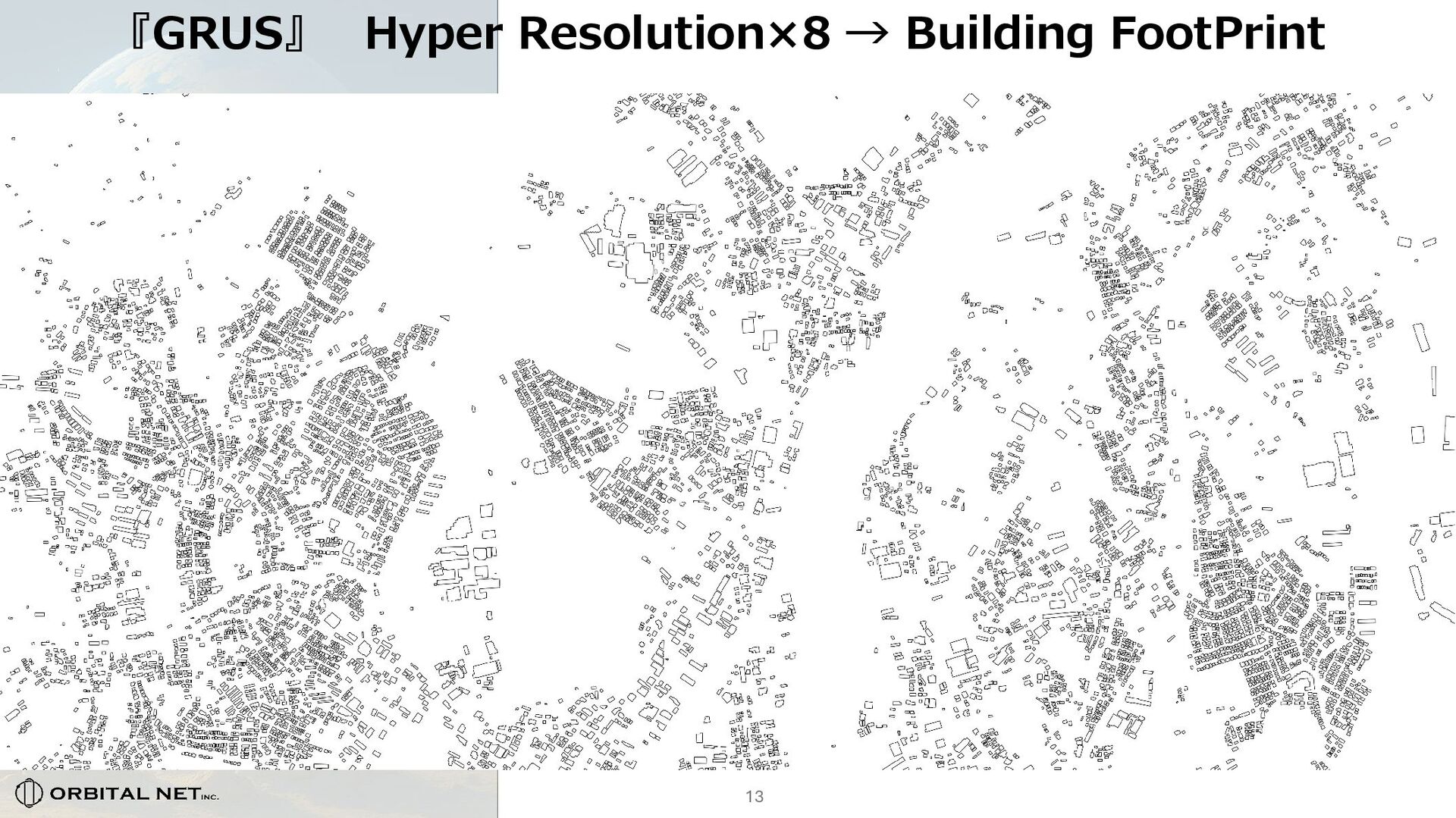 オービタルネットでは、様々な衛星画像を用いた地理空間情報の生成を行っています。本発表では、Capella(SAR), Sentinel-2, GRUS, WorldView-2, 3などさまざまな衛星画像を、拡散モデルベースの画像生成AIにより超(超)解像画像を生成したのち、2D(セグメンテーションとマスク正規化)及び3D(単眼深度推定=衛星画像からレーザー点群やDEMを用いず建物3Dモデルを生成)の地理空間情報を即時生成する取り組みをご紹介します。また、衛星画像の入力から地理空間情報の出力までをE2Eで実現する “AI as a Service” に向けた取り組みや、最近話題のS2DR3やDINOv3等の衛星画像解析のSOTAモデルについても触れたいと考えます。