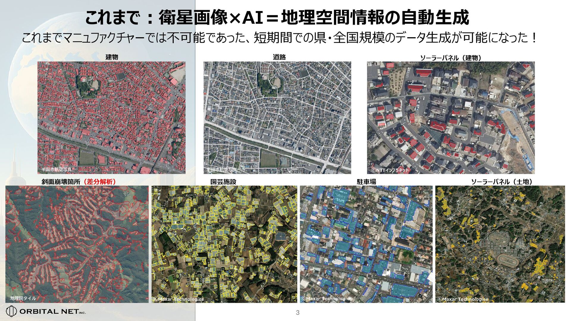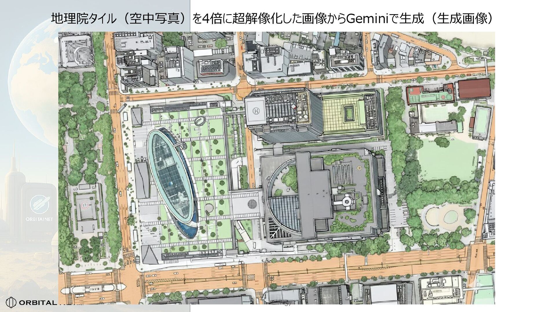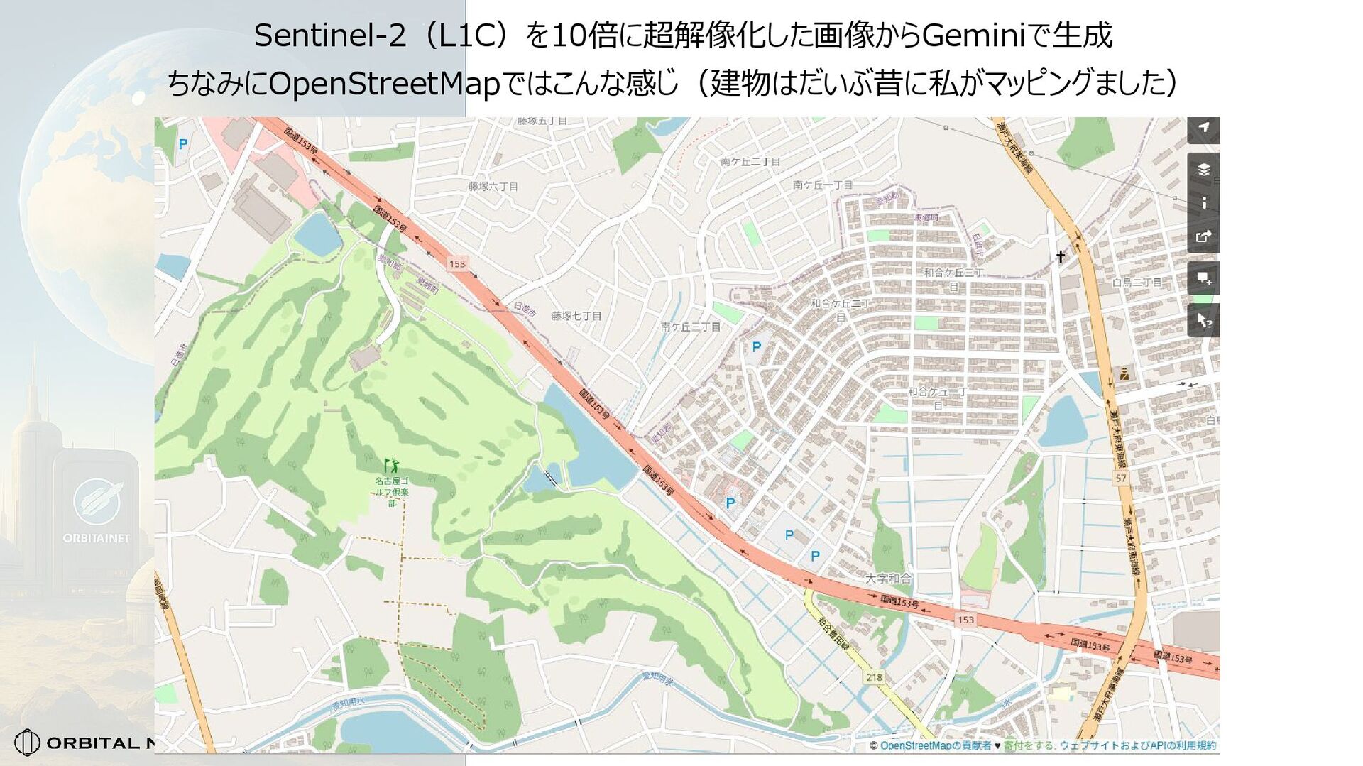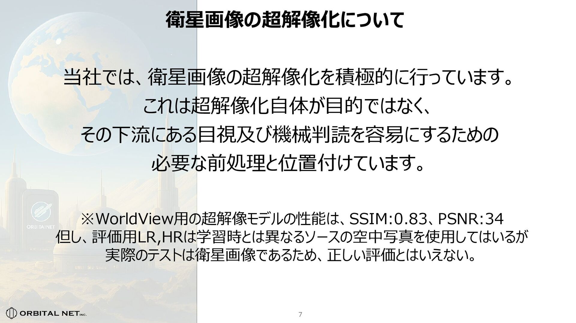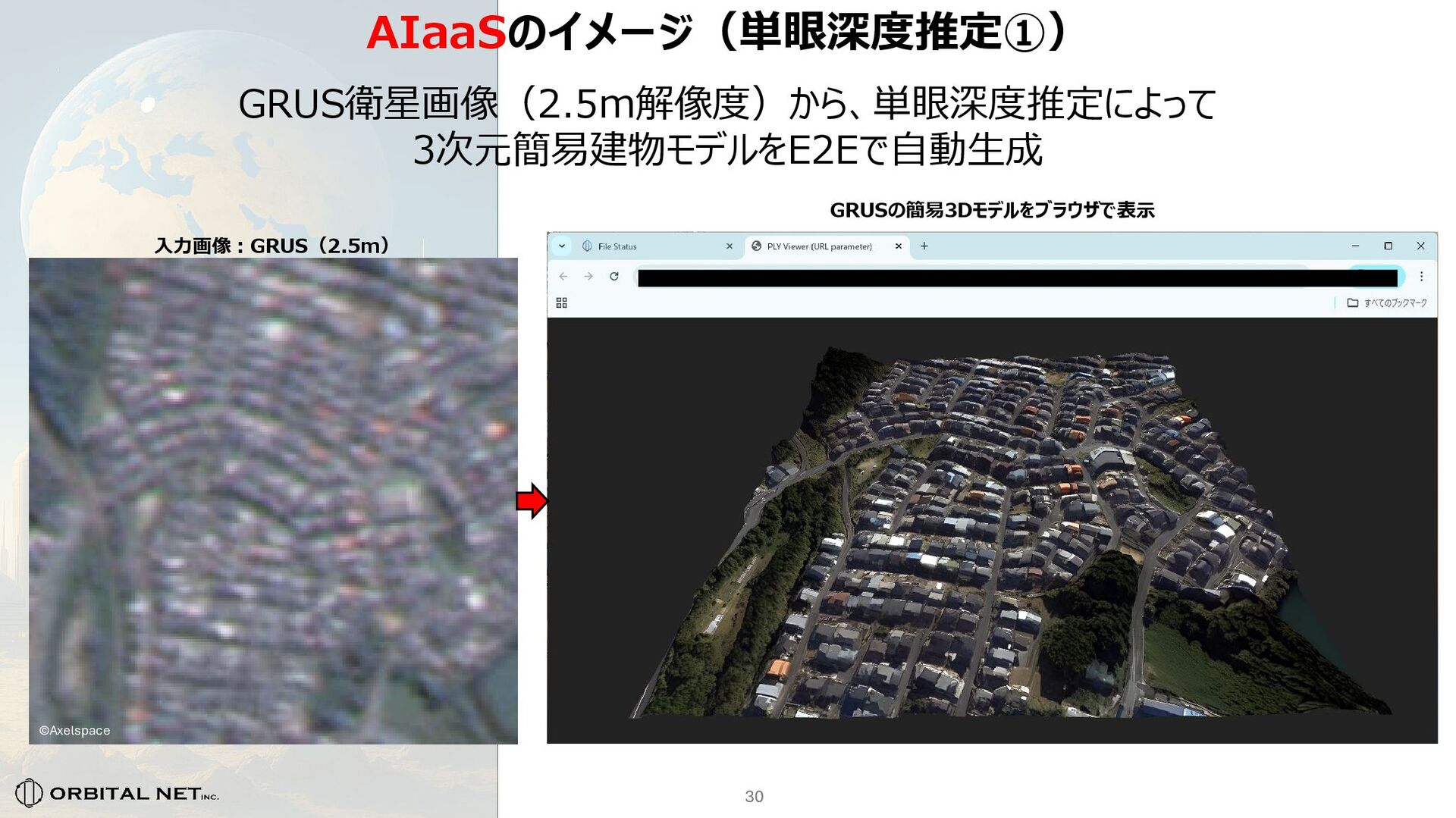 オービタルネットでは、様々な衛星画像を用いた地理空間情報の生成を行っています。本発表では、Capella(SAR), Sentinel-2, GRUS, WorldView-2, 3などさまざまな衛星画像を、拡散モデルベースの画像生成AIにより超(超)解像画像を生成したのち、2D(セグメンテーションとマスク正規化)及び3D(単眼深度推定=衛星画像からレーザー点群やDEMを用いず建物3Dモデルを生成)の地理空間情報を即時生成する取り組みをご紹介します。また、衛星画像の入力から地理空間情報の出力までをE2Eで実現する “AI as a Service” に向けた取り組みや、最近話題のS2DR3やDINOv3等の衛星画像解析のSOTAモデルについても触れたいと考えます。