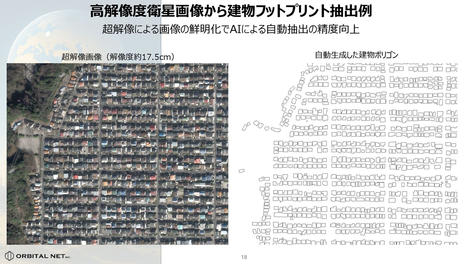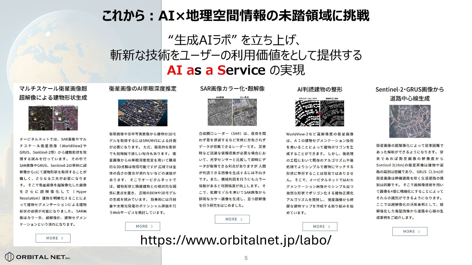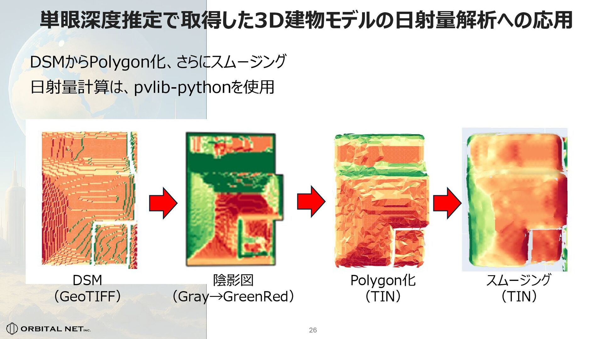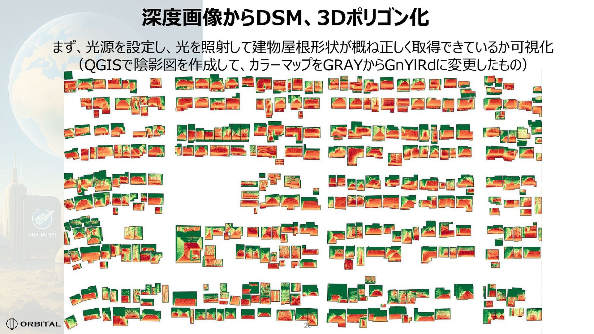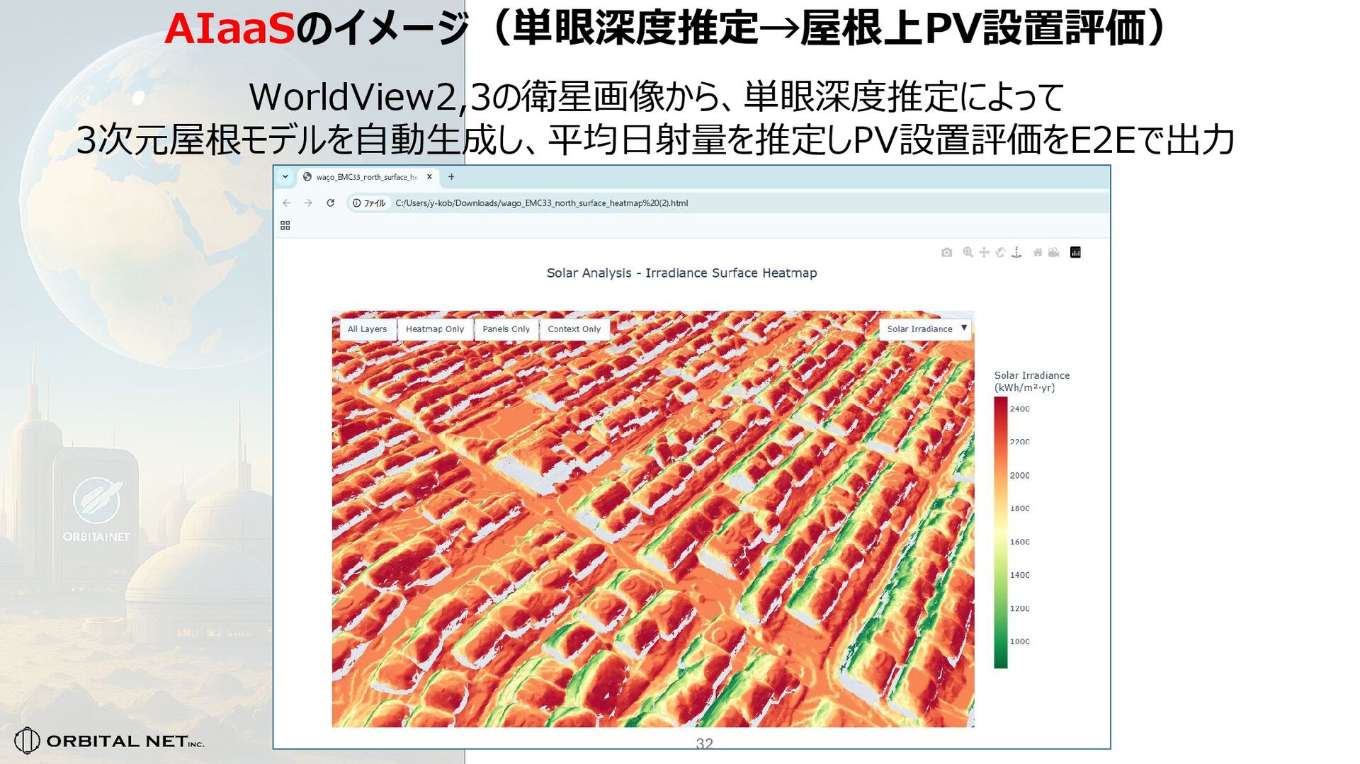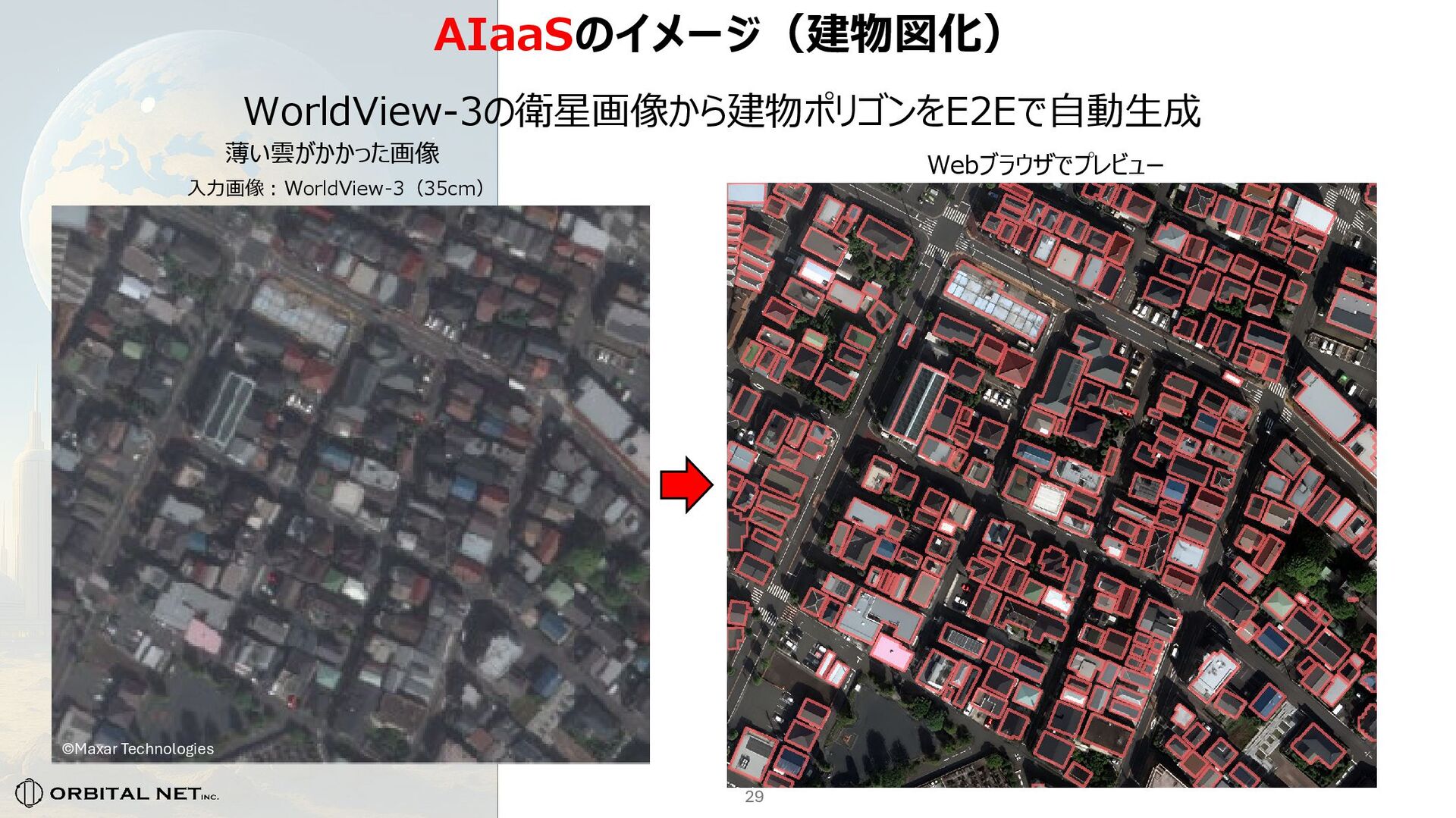 オービタルネットでは、様々な衛星画像を用いた地理空間情報の生成を行っています。本発表では、Capella(SAR), Sentinel-2, GRUS, WorldView-2, 3などさまざまな衛星画像を、拡散モデルベースの画像生成AIにより超(超)解像画像を生成したのち、2D(セグメンテーションとマスク正規化)及び3D(単眼深度推定=衛星画像からレーザー点群やDEMを用いず建物3Dモデルを生成)の地理空間情報を即時生成する取り組みをご紹介します。また、衛星画像の入力から地理空間情報の出力までをE2Eで実現する “AI as a Service” に向けた取り組みや、最近話題のS2DR3やDINOv3等の衛星画像解析のSOTAモデルについても触れたいと考えます。
