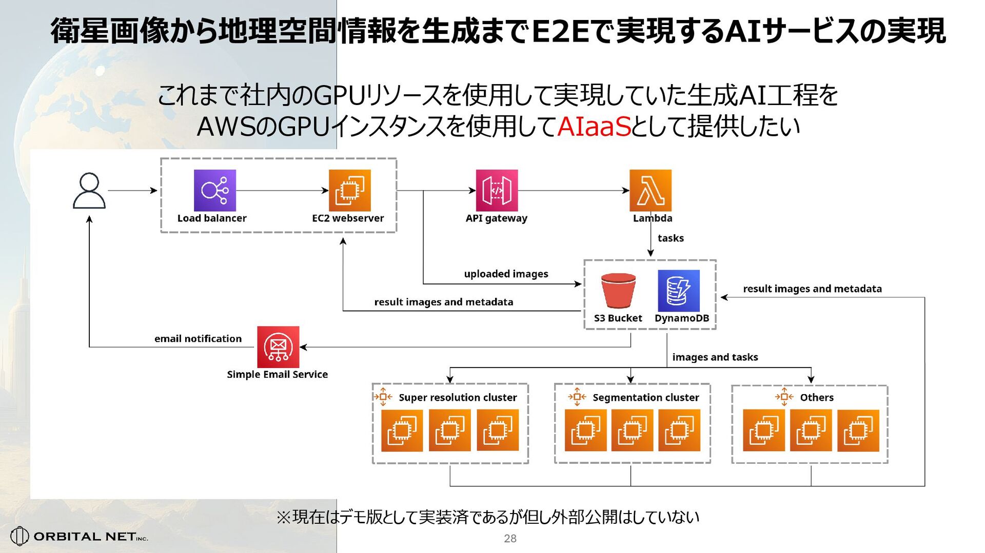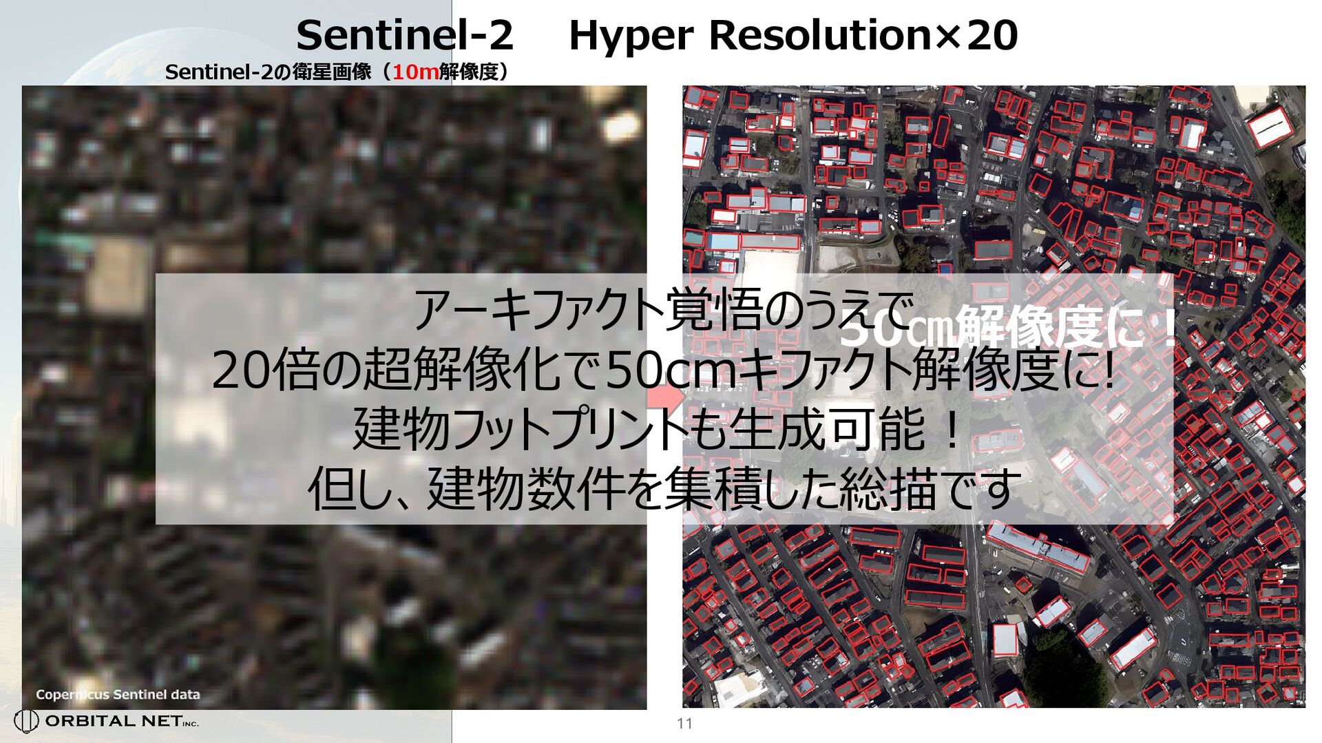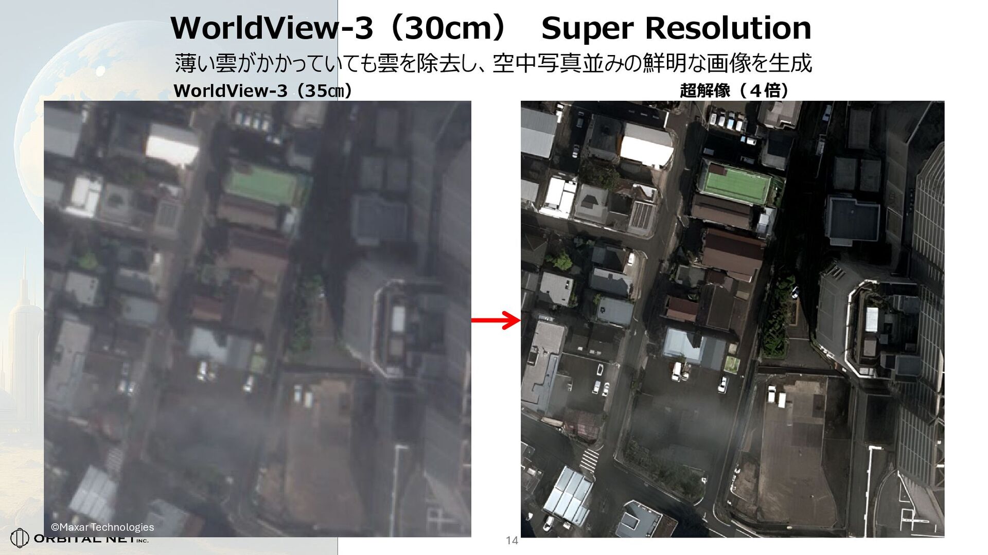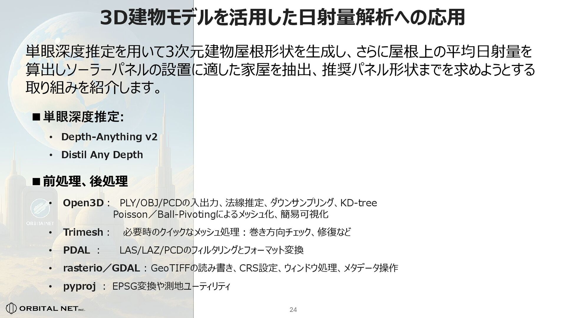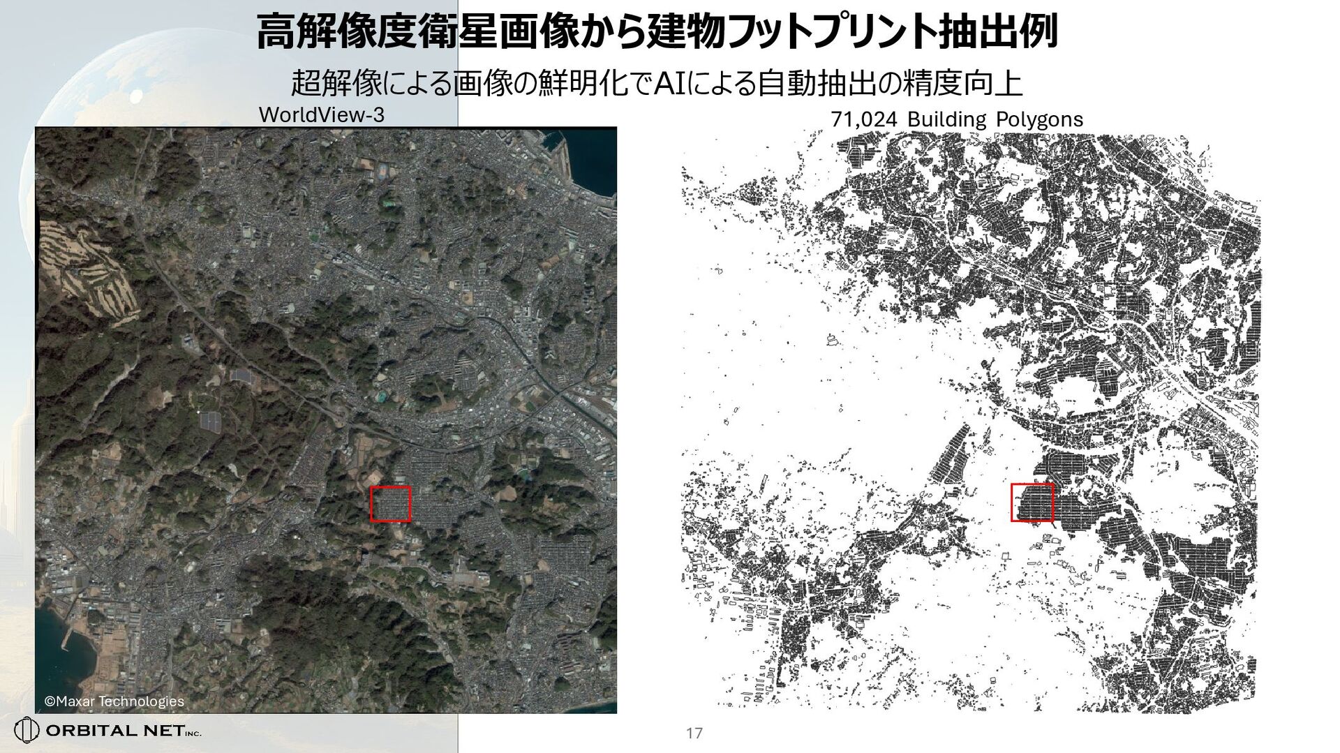 オービタルネットでは、様々な衛星画像を用いた地理空間情報の生成を行っています。本発表では、Capella(SAR), Sentinel-2, GRUS, WorldView-2, 3などさまざまな衛星画像を、拡散モデルベースの画像生成AIにより超(超)解像画像を生成したのち、2D(セグメンテーションとマスク正規化)及び3D(単眼深度推定=衛星画像からレーザー点群やDEMを用いず建物3Dモデルを生成)の地理空間情報を即時生成する取り組みをご紹介します。また、衛星画像の入力から地理空間情報の出力までをE2Eで実現する “AI as a Service” に向けた取り組みや、最近話題のS2DR3やDINOv3等の衛星画像解析のSOTAモデルについても触れたいと考えます。