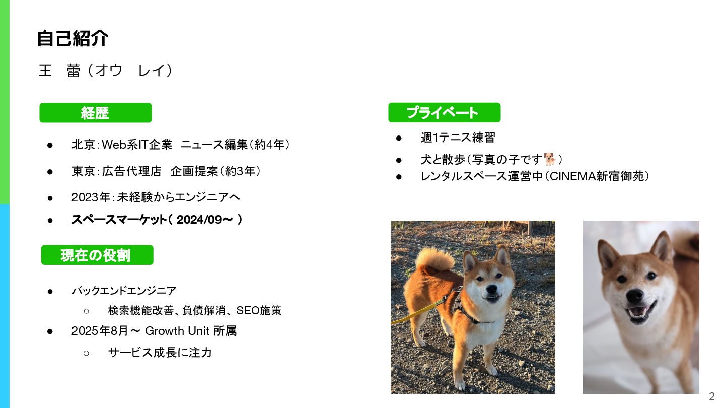 2023年:未経験からエンジニアへ • スペースマーケット( 2024/09〜 ) 経歴 • 週1テニス練習 • 犬と散歩(写真の子です🐕) • レンタルスペース運営中(CINEMA新宿御苑) プライベート • バックエンドエンジニア ◦ 検索機能改善、負債解消、 SEO施策 • 2025年8月〜 Growth Unit 所属 ◦ サービス成長に注力 現在の役割