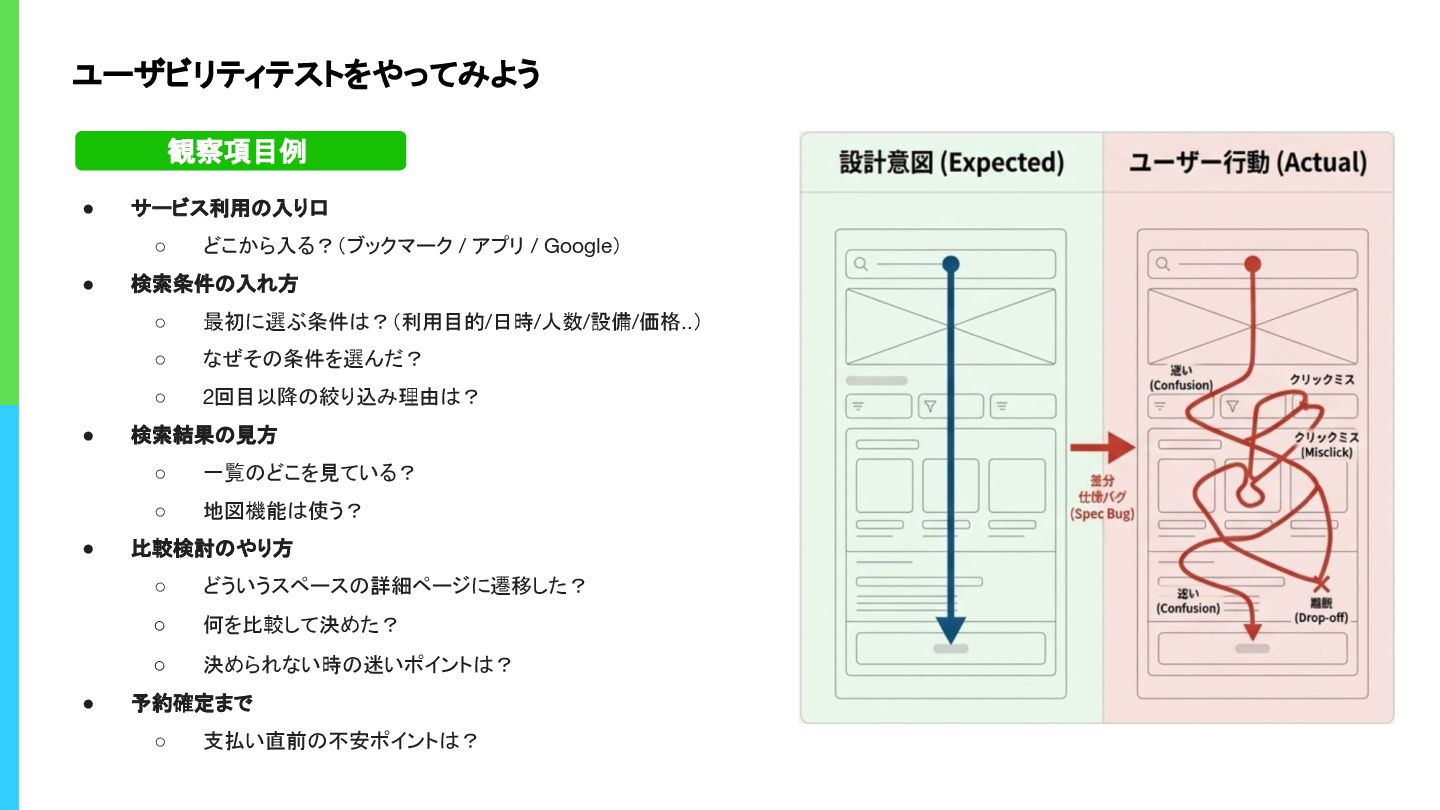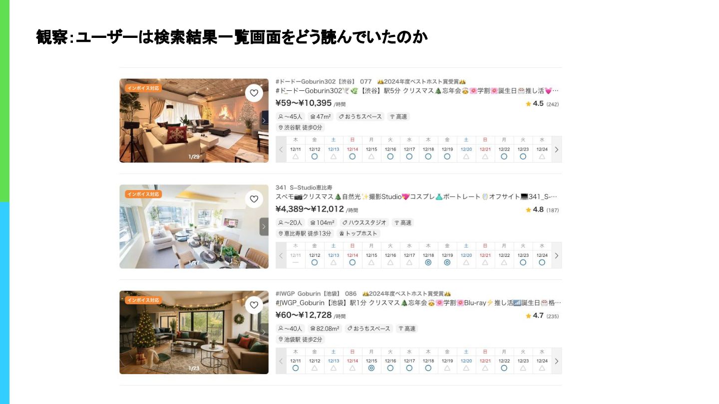 検索条件の入れ方 ◦ 最初に選ぶ条件は?(利用目的/日時/人数/設備/価格..) ◦ なぜその条件を選んだ? ◦ 2回目以降の絞り込み理由は? • 検索結果の見方 ◦ 一覧のどこを見ている? ◦ 地図機能は使う? • 比較検討のやり方 ◦ どういうスペースの詳細ページに遷移した? ◦ 何を比較して決めた? ◦ 決められない時の迷いポイントは? • 予約確定まで ◦ 支払い直前の不安ポイントは? 観察項目例